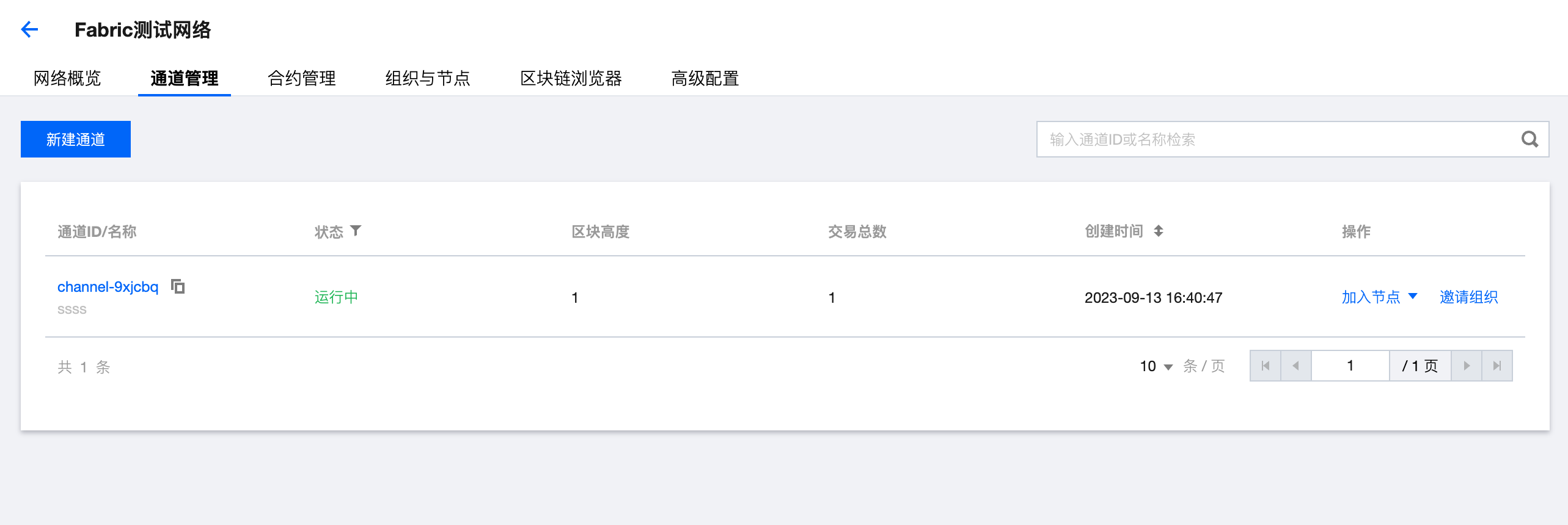 2. 选择通道管理页签,即可看到当前所有通道信息,包括通道ID/名称、区块高度、交易总数、创建时间等,如下图所示: