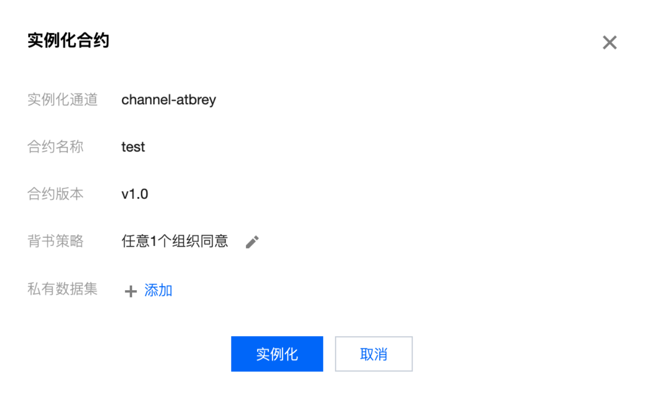 完成安装的合约即可进行实例化,在合约管理页面中点击合约列表操作列的实例化,在实例化弹窗中可根据需要设置背书策略及私有数据集等信息,确认后即可开始实例化。如下图所示: