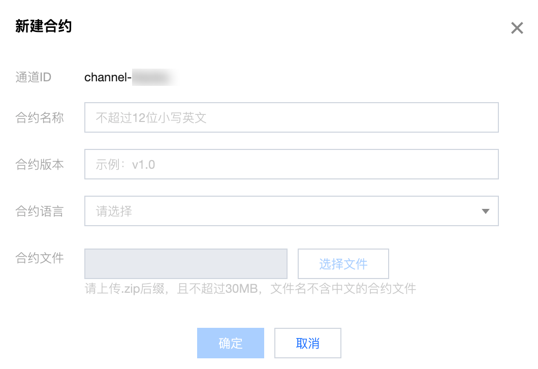 3. 单击新建合约,在弹窗中填写对应的合约名称、版本等信息,并上传合约文件。如下图所示: