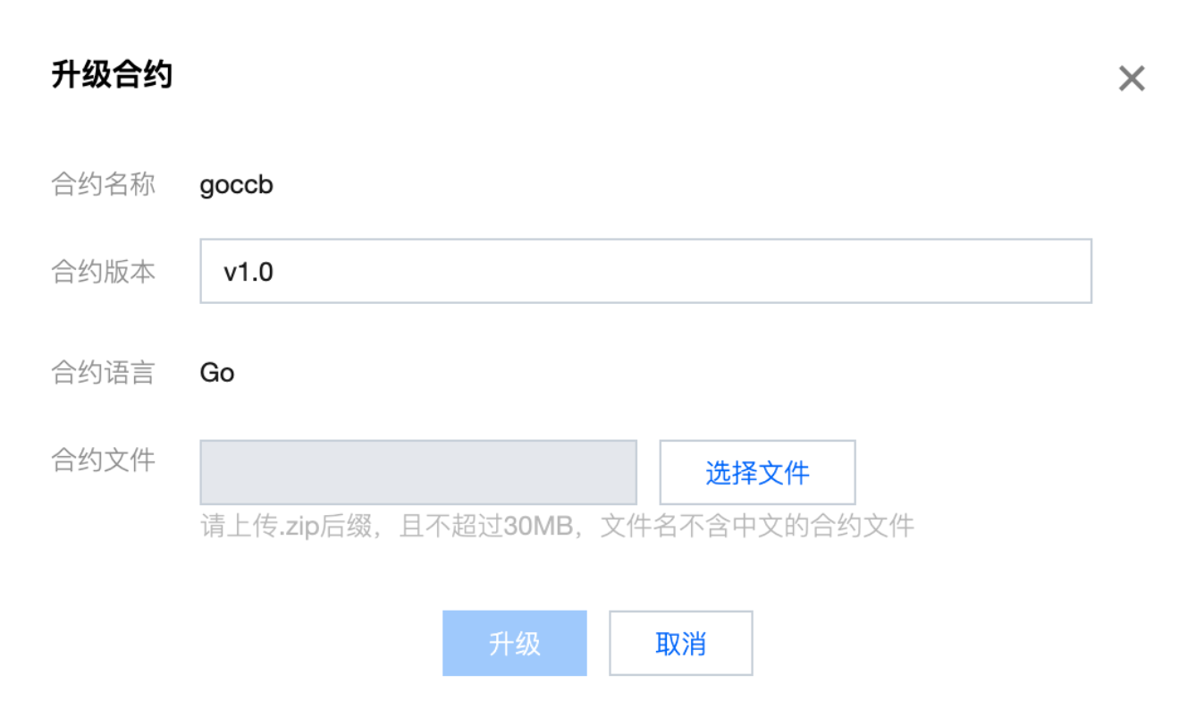 在合约管理页签中,单击合约列表右侧列中的升级,在弹窗中填写新的版本号、上传新的合约文件后即可完成合约的升级。如下图所示: