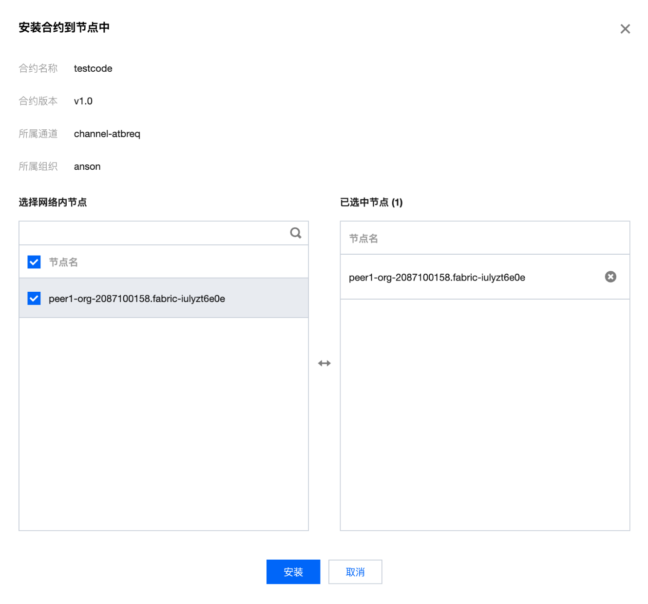 新建完成的合约需安装到 Peer 节点中,并进行实例化后才可运行调用。在合约管理页面中新建完成合约后,在合约列表中即可看到新建的合约,状态处于“未实例化”。单击列表操作列的安装,在弹窗中选择需要安装的 Peer 节点,勾选后单击安装即可完成。如下图所示: