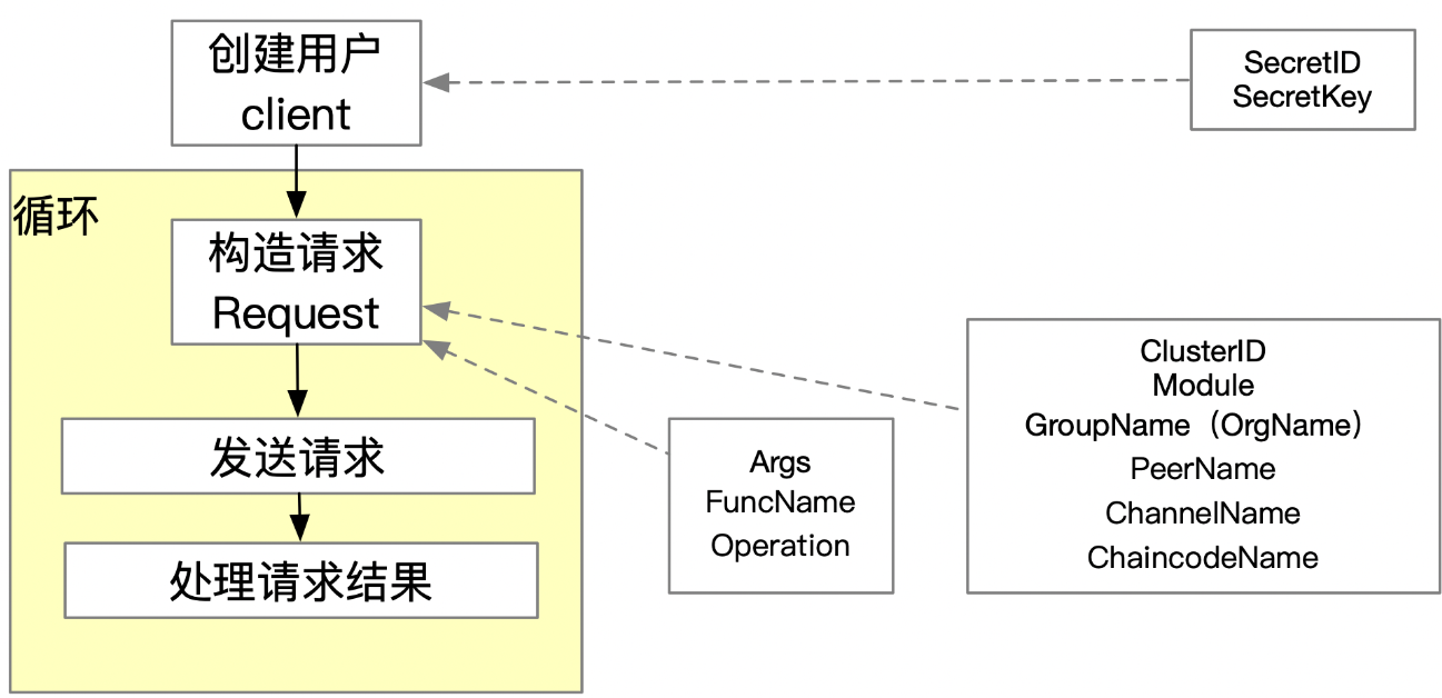 使用云 API 调用合约时除了需要网络、合约的相关参数,还需要提供购买 TBaaS 节点的账户信息,包括 SecretId 和 SecretKey。