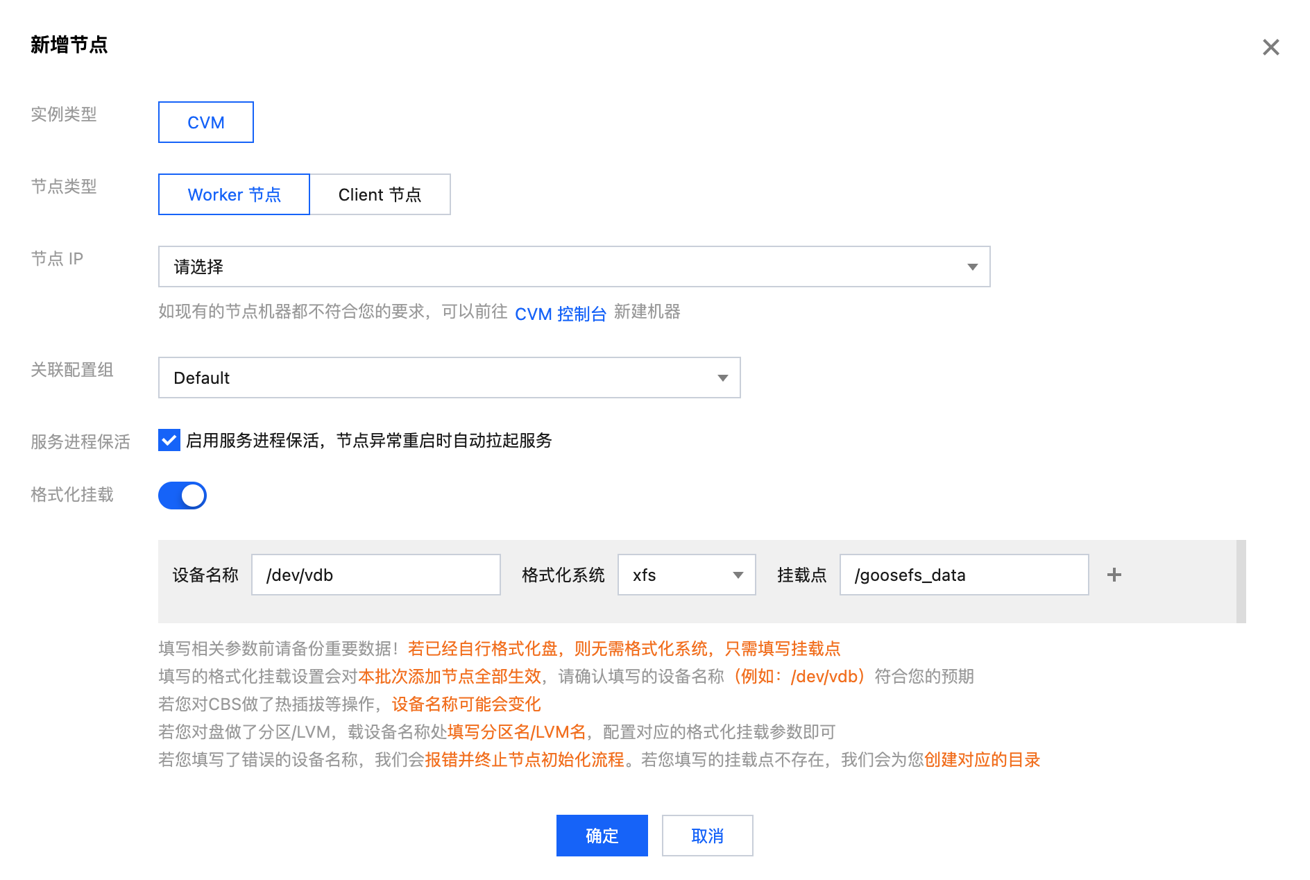 新增节点:用于往 GooseFS 集群中新增一个节点,可选参数如下: