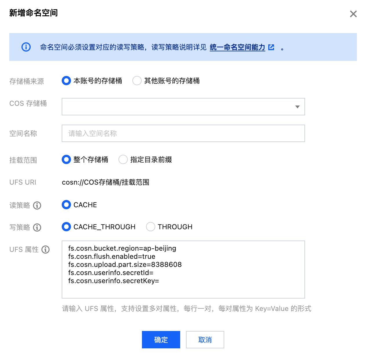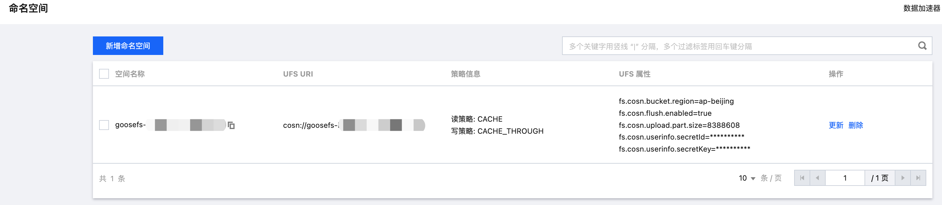 通过命名空间管理支持创建、更新、删除命名空间,为 GooseFS 集群关联 COS 存储桶并设置缓存读写策略。