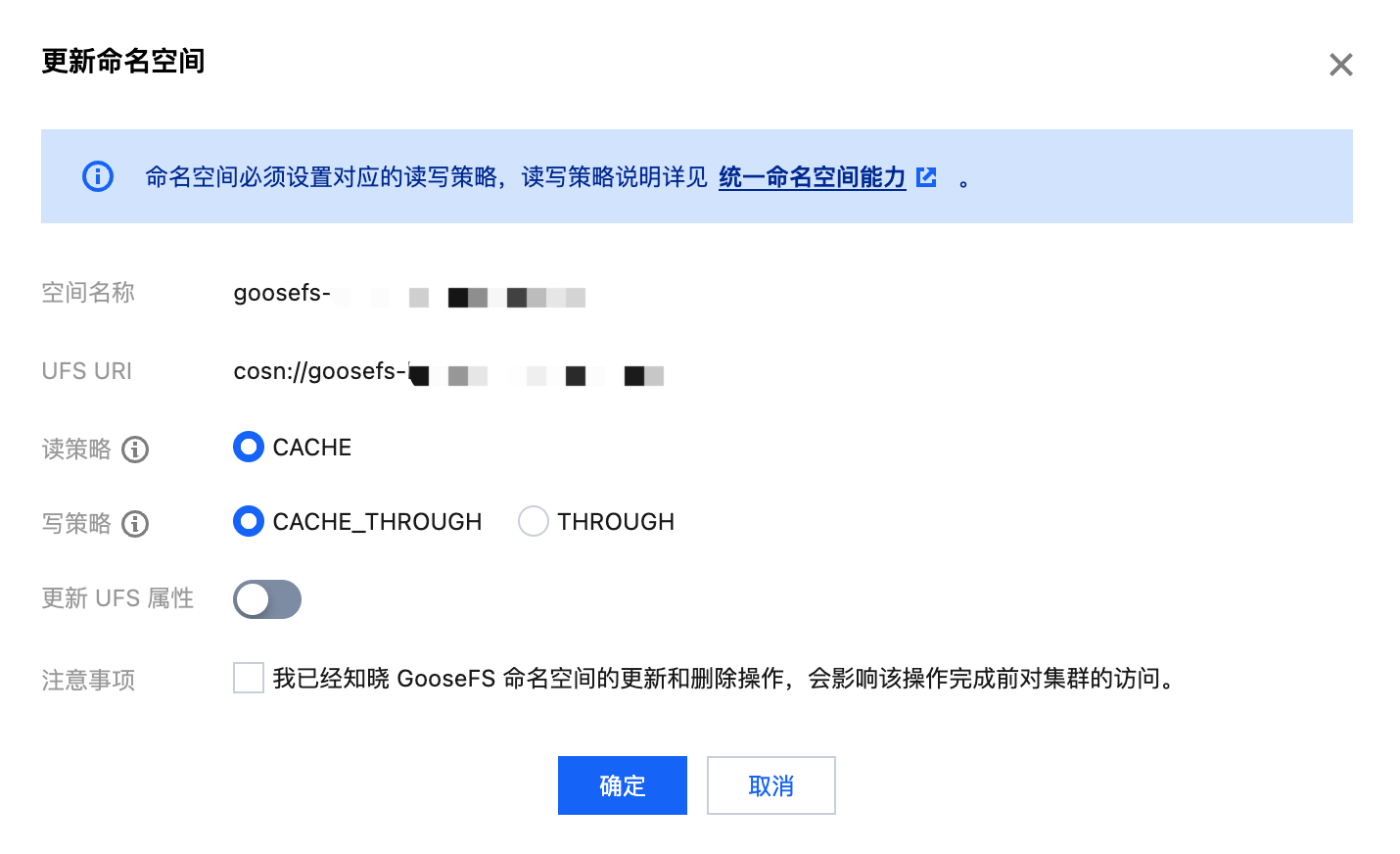 更新操作:支持修改写策略和 UFS 属性,命名空间名称创建后无法修改。