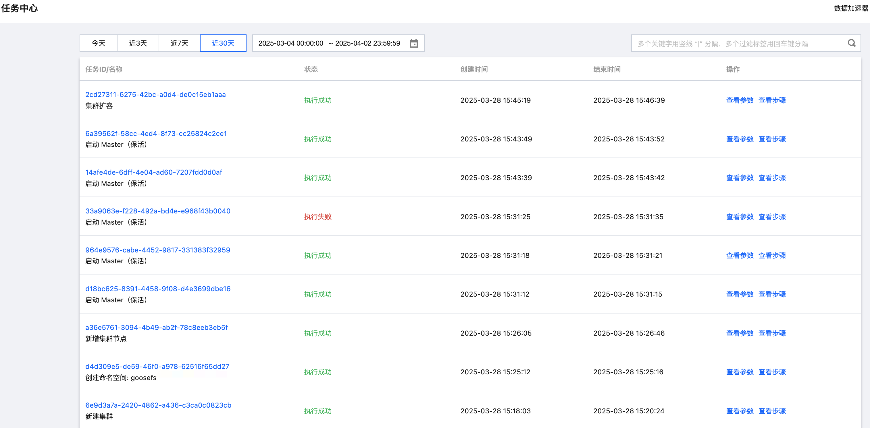 GooseFS 集群的创建、集群管理和删除等操作都被视为异步任务处理。您可以通过 GooseFS 控制台,在 GooseFS 集群详情页中管理所有集群相关的任务。下面为您详细介绍如何管理 GooseFS 集群任务。