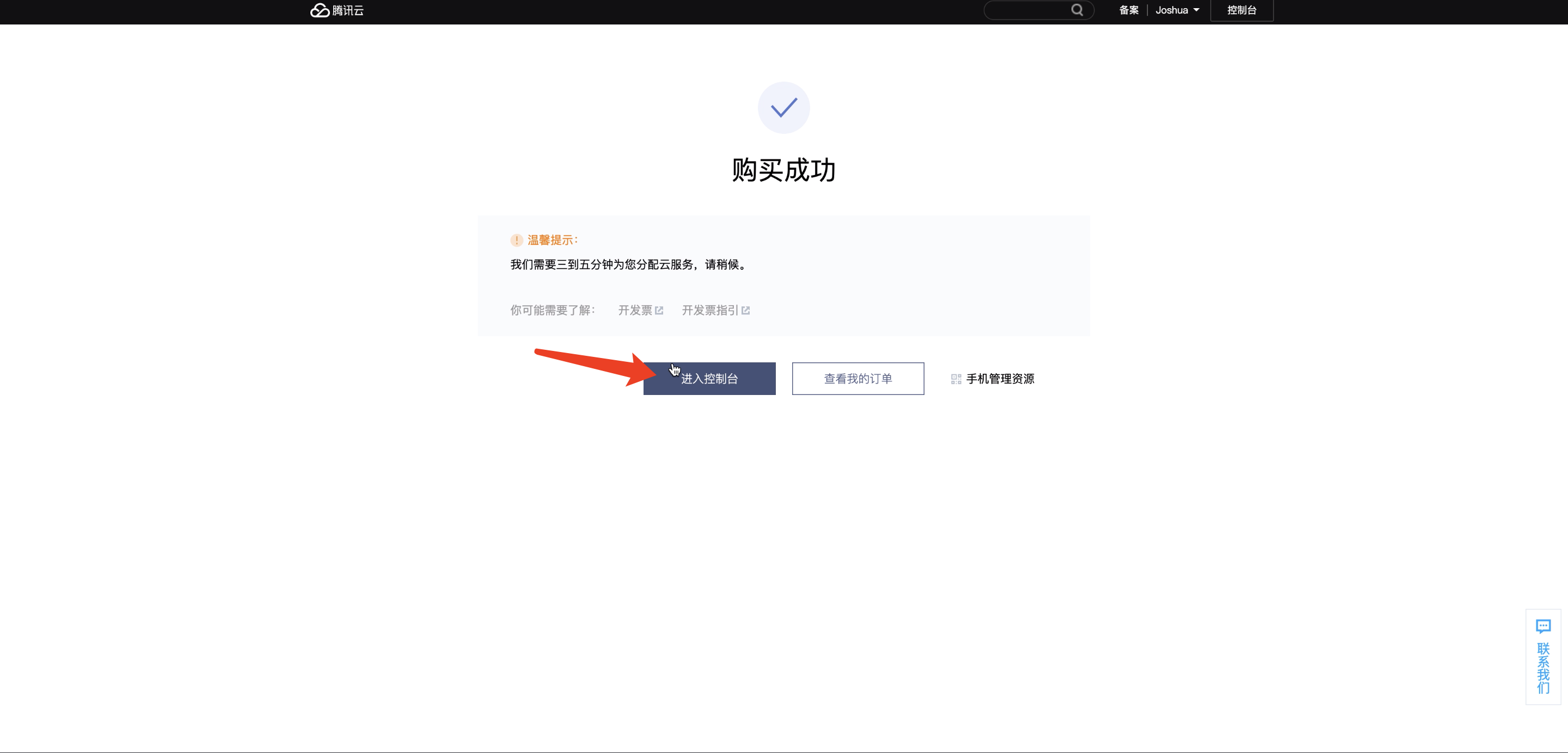 支付成功后将进入购买成功页面,此时单击进入控制台则可跳转至 BI 控制台开始使用。