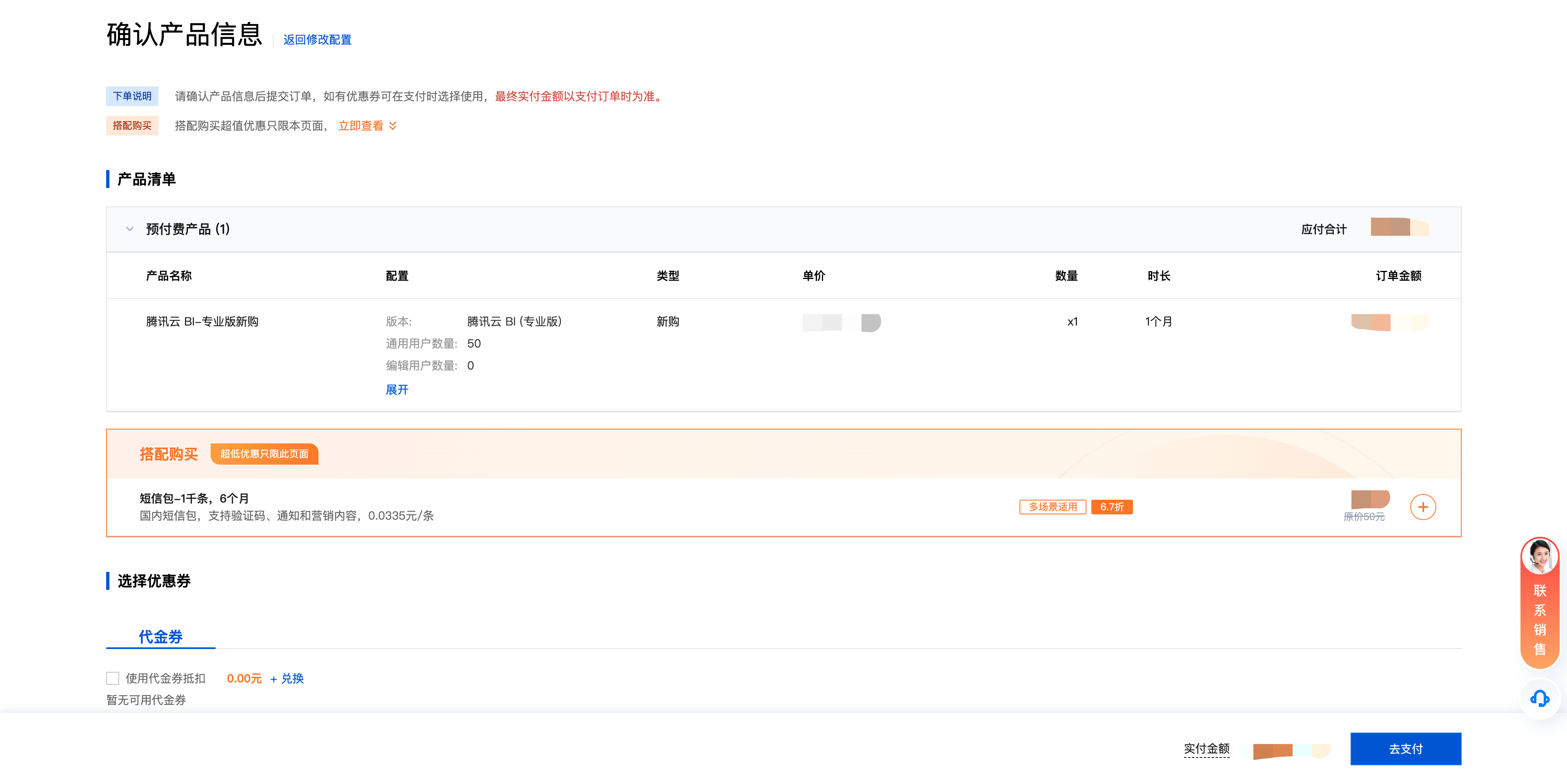 在此页面,您可对购买的内容、价格进行进一步确认,并可选择是否使用账号中的代金券,确认无误后,单击提交订单即可进行支付。