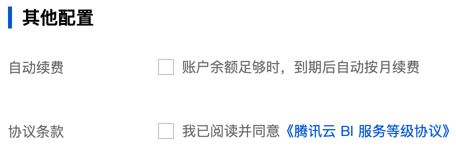 自动续费:若您期望在BI到期时自动进行续费,避免未及时续费导致无法使用甚至资源销毁的情况,可勾选此选项,非必选。