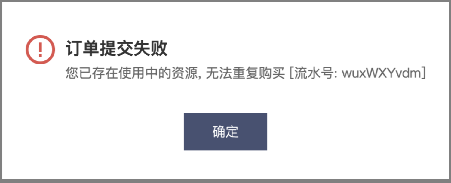 若提交订单时出现报错,则代表您已购买过BI,仅能进行续费、升级操作,无法重复购买。