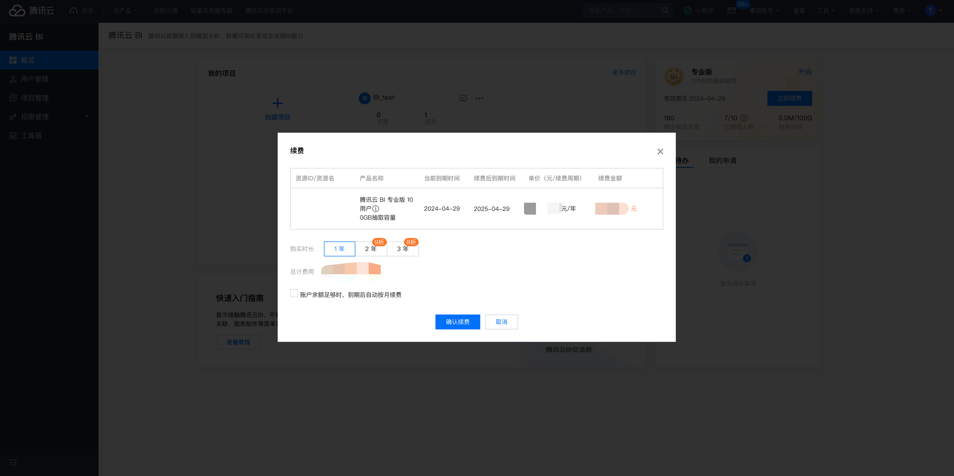 腾讯云 BI 支持用户根据自身业务情况进行续费,延长产品使用时长。