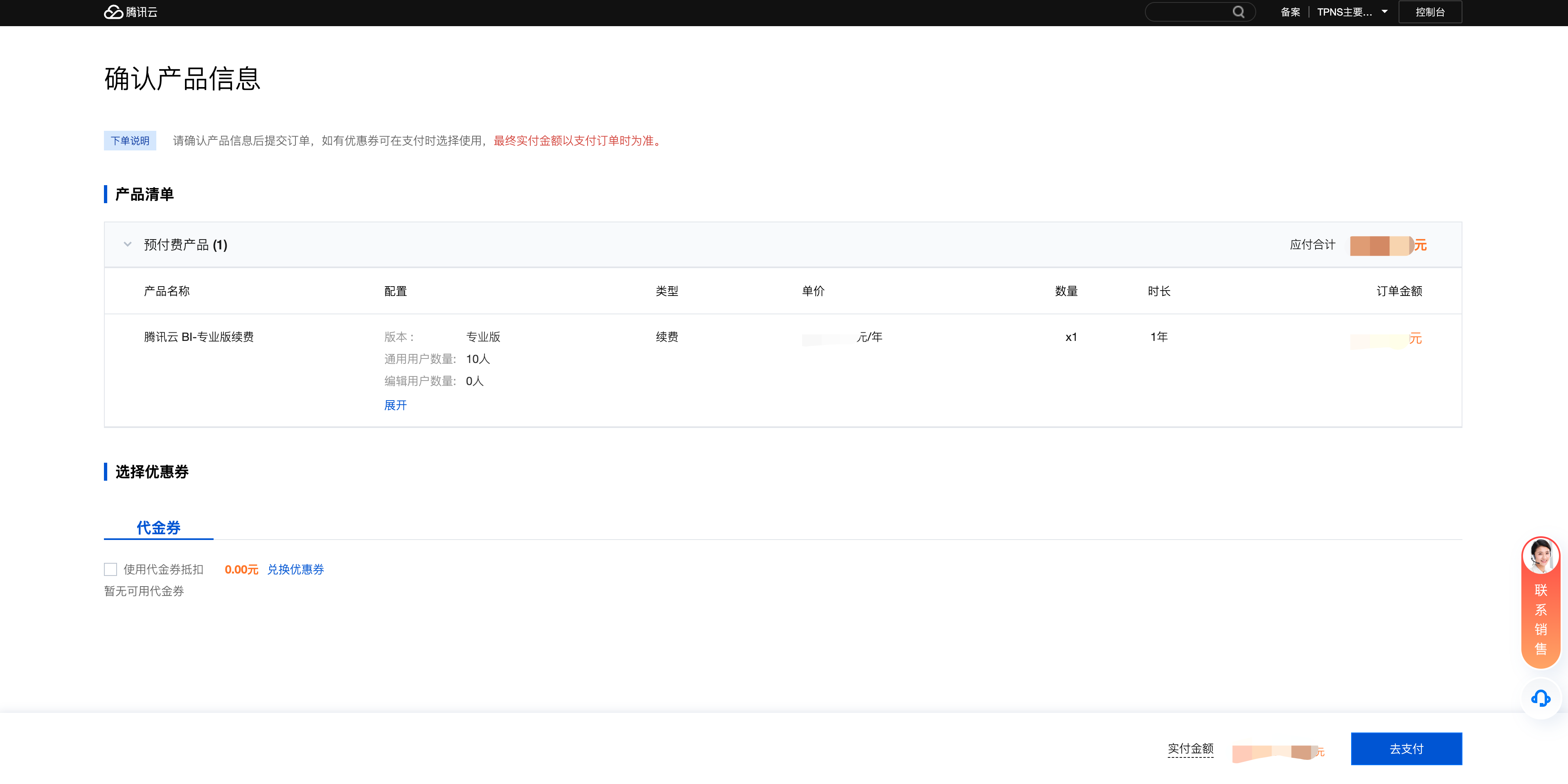 1. 登录 BI 控制台,在右侧版本信息单击立即续费(此为常驻入口,也可通过续费场景中提到的即将到期和已到期时提供的入口触发续费流程) 2. 此时会显示您当前的到期时间,续费后的到期时间及续费的费用。单击确认续费后,将进入订单确认页。 3. 在订单确认页,您可对续费的内容、费用进行进一步确认,并可选择是否使用账号中的代金券,确认无误后,单击提交订单即可进行支付。 4. 支付成功后将进入以下页面,此时续费流程结束,单击进入控制台则可跳转至 BI 控制台继续使用。