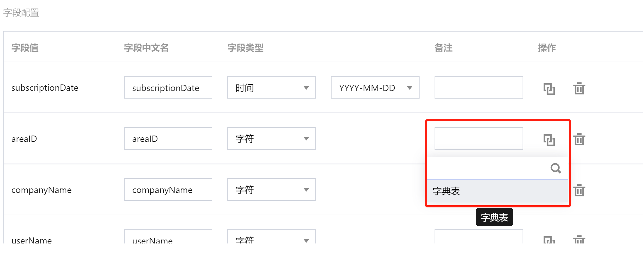 操作:可进行字典表关联、字段删除操作当选择关联字典时,可选择需要关联的字典表进行映射。 操作项