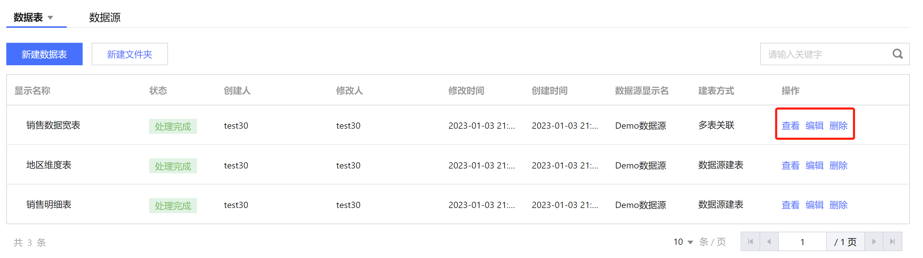 编辑:可单击对数据表进行编辑,包括新建数据表参数和字段配置等信息