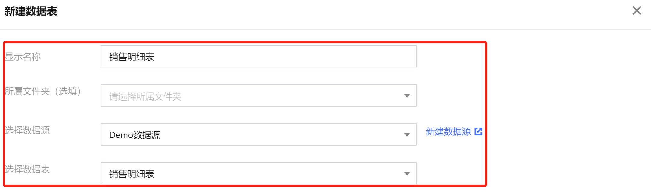 在数据 > 数据表模块中,单击新建数据表,选择数据源表,输入以下参数: