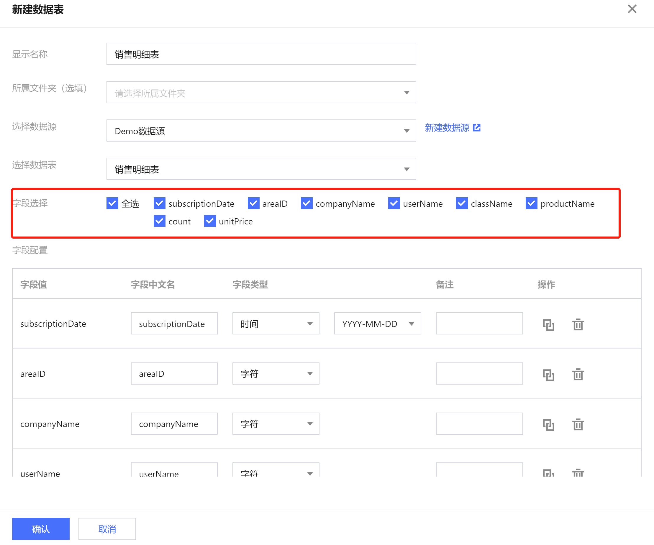 1. 选择数据表后,将加载出该表的所有字段,支持进行勾选,勾选的字段为数据表的字段,支持全选。 2. 字段配置的各项配置含义如下
