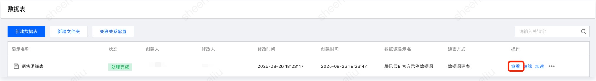 在数据 > 数据表模块中,针对需要新增计算字段的数据表单击查看: