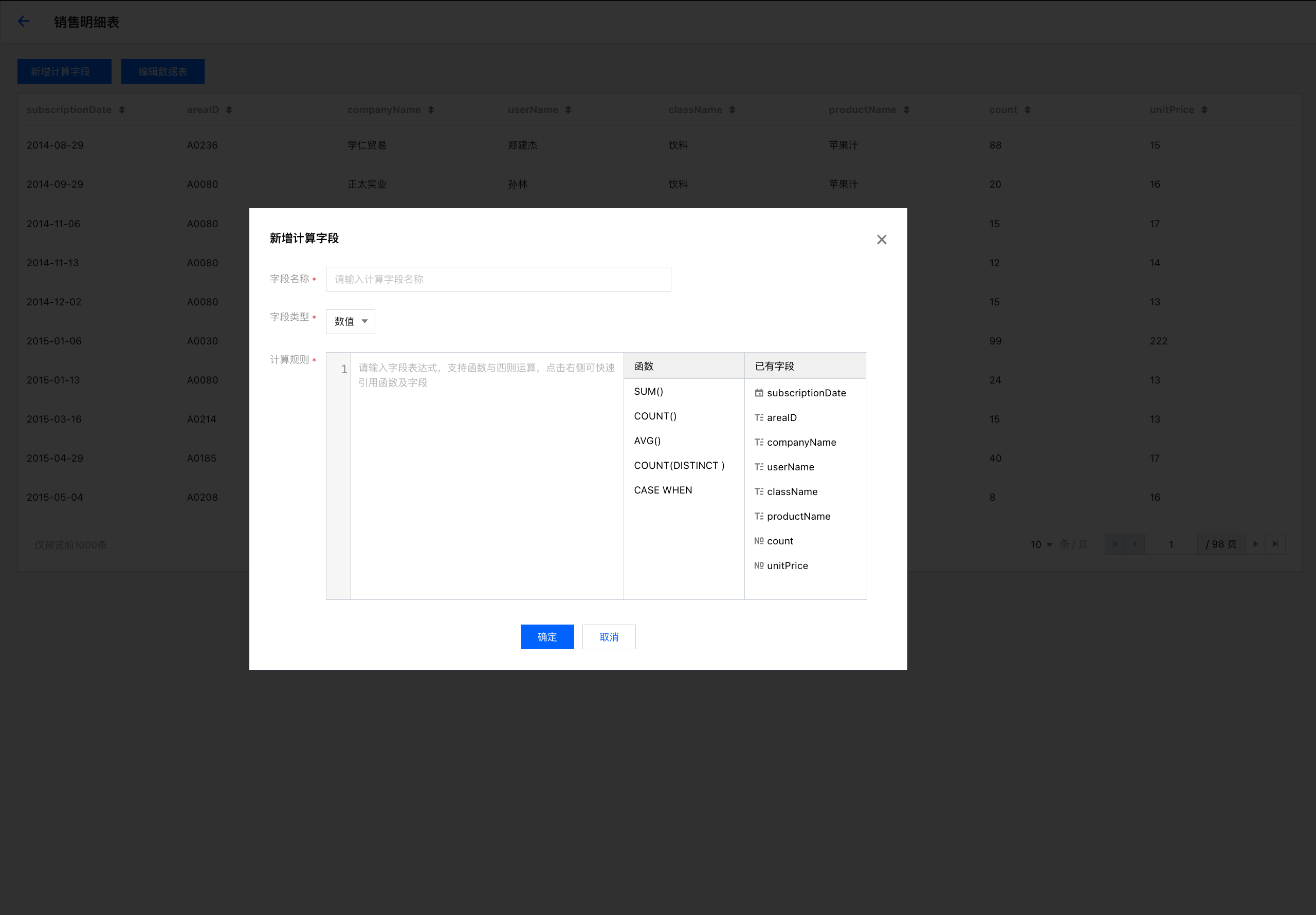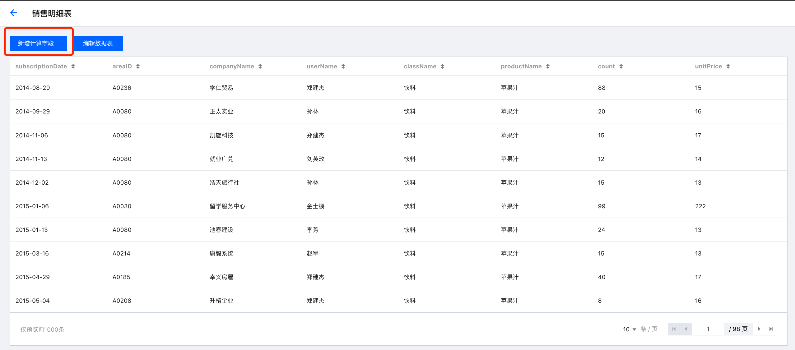 配置完计算字段信息确定保存后,在数据表明细查看界面即可预览到新增的计算字段;若计算字段中如涉及到聚合函数计算,如 sum()、count()、avg() 等聚合函数,在数据表明细查看界面则无法直接预览数据,会显示为“-”,需要在报表页面配置图表维度/指标时方可进行聚合计算展示。