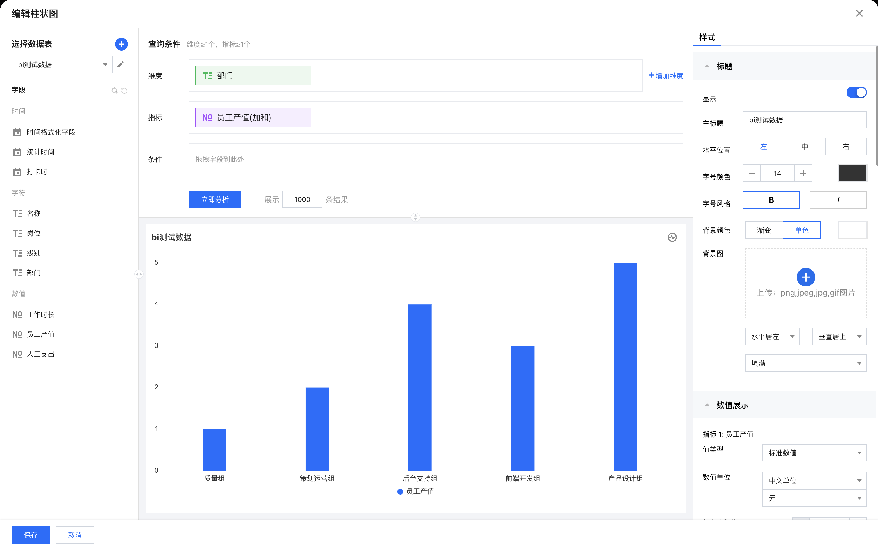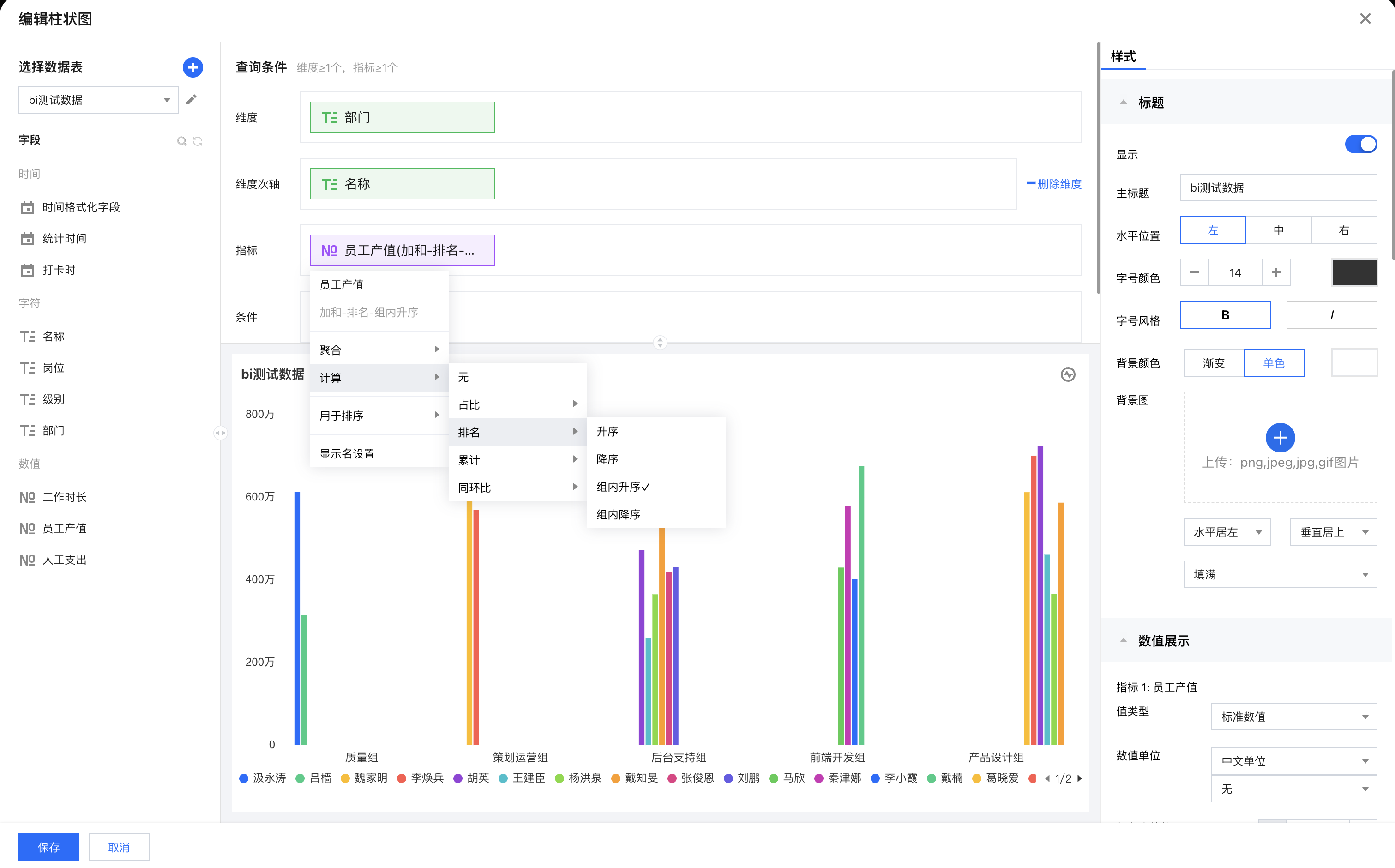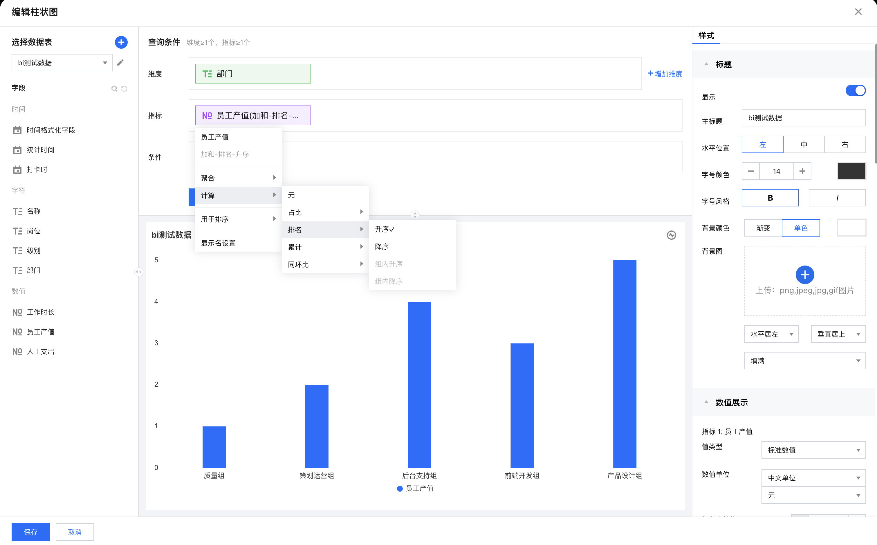 1. 进入画布,添加柱图组件,设置维度,次轴,指标。 2. 在指标字段依次选择快捷计算 > 排名 > 组内升序。