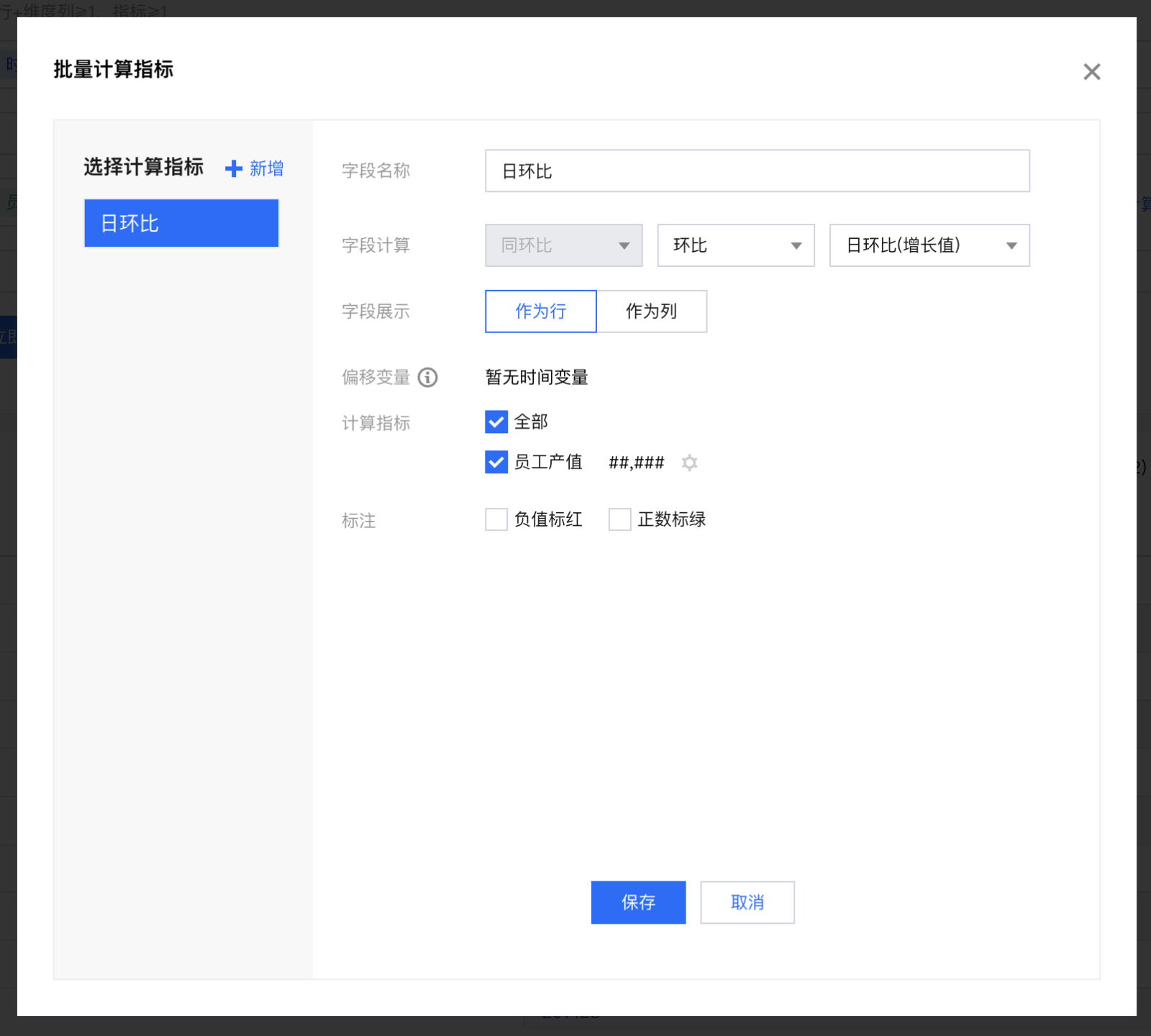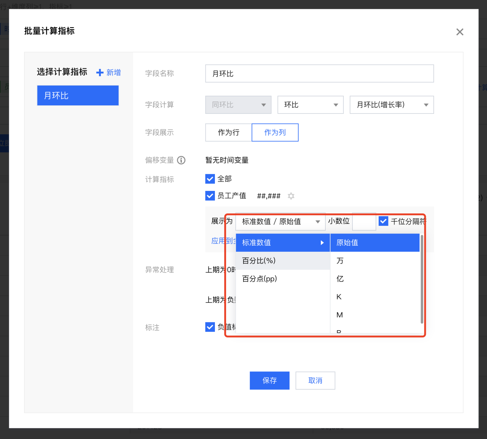 异常处理 | 当选择是“增长率”类型计算时,会碰到上期为0或者上期为负数的问题,通过异常处理,可防止数据计算报错或更合理展示数据 | 如对上期销量为0的部门,计算“环比上期(增长率)”时展示为“-”,则可选“展示为-” |