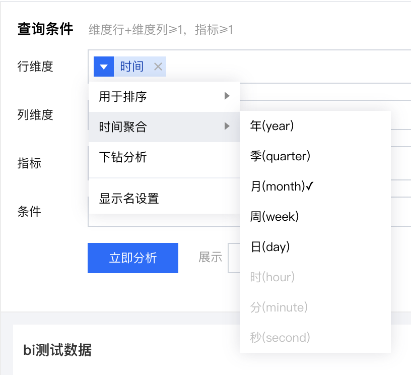 字段计算 | 当前仅支持同环比计算,根据图表的时间维度聚合颗粒度来确定可同环比的粒度 | 如时间字段“数据时间”的聚合为“月”,则可选“环比” > “月环比” |