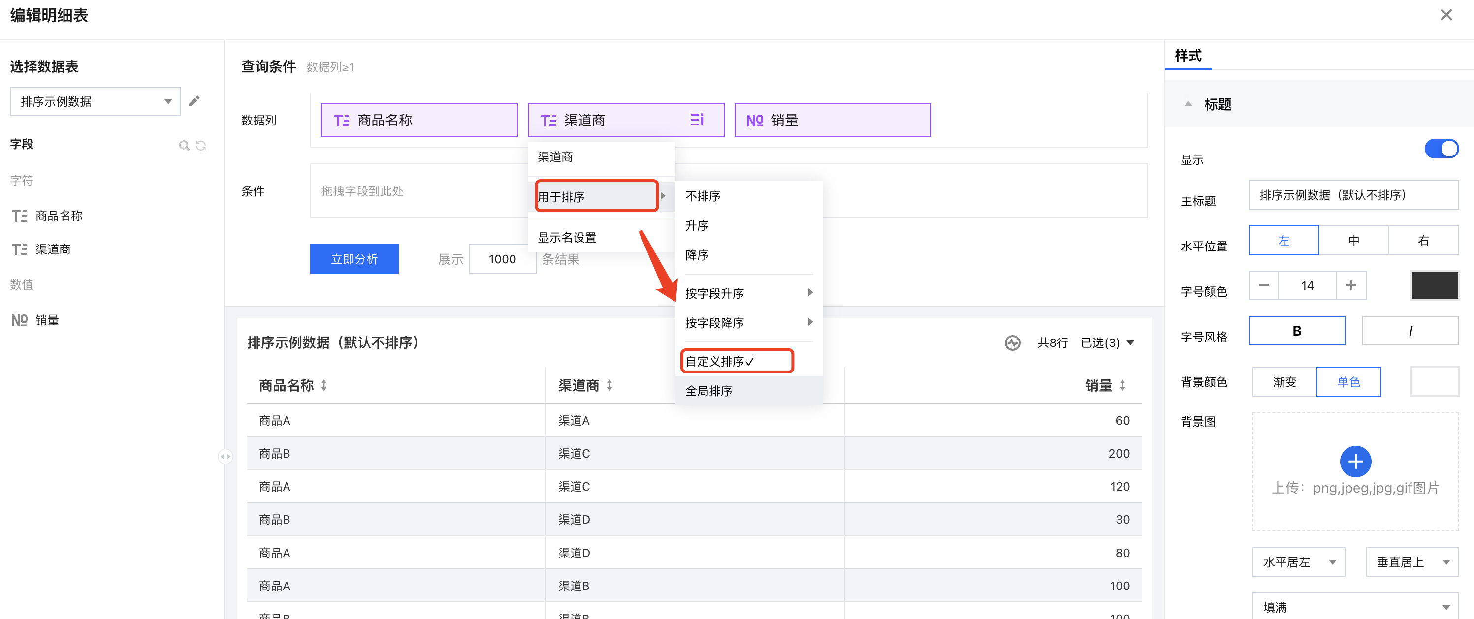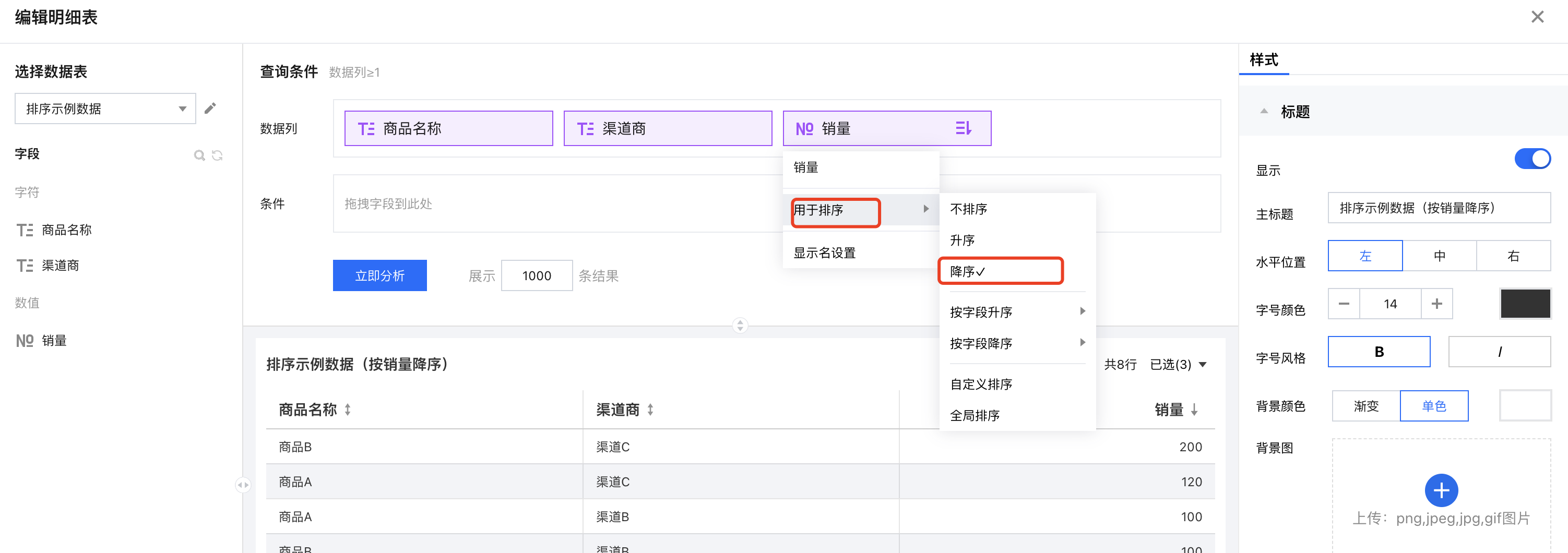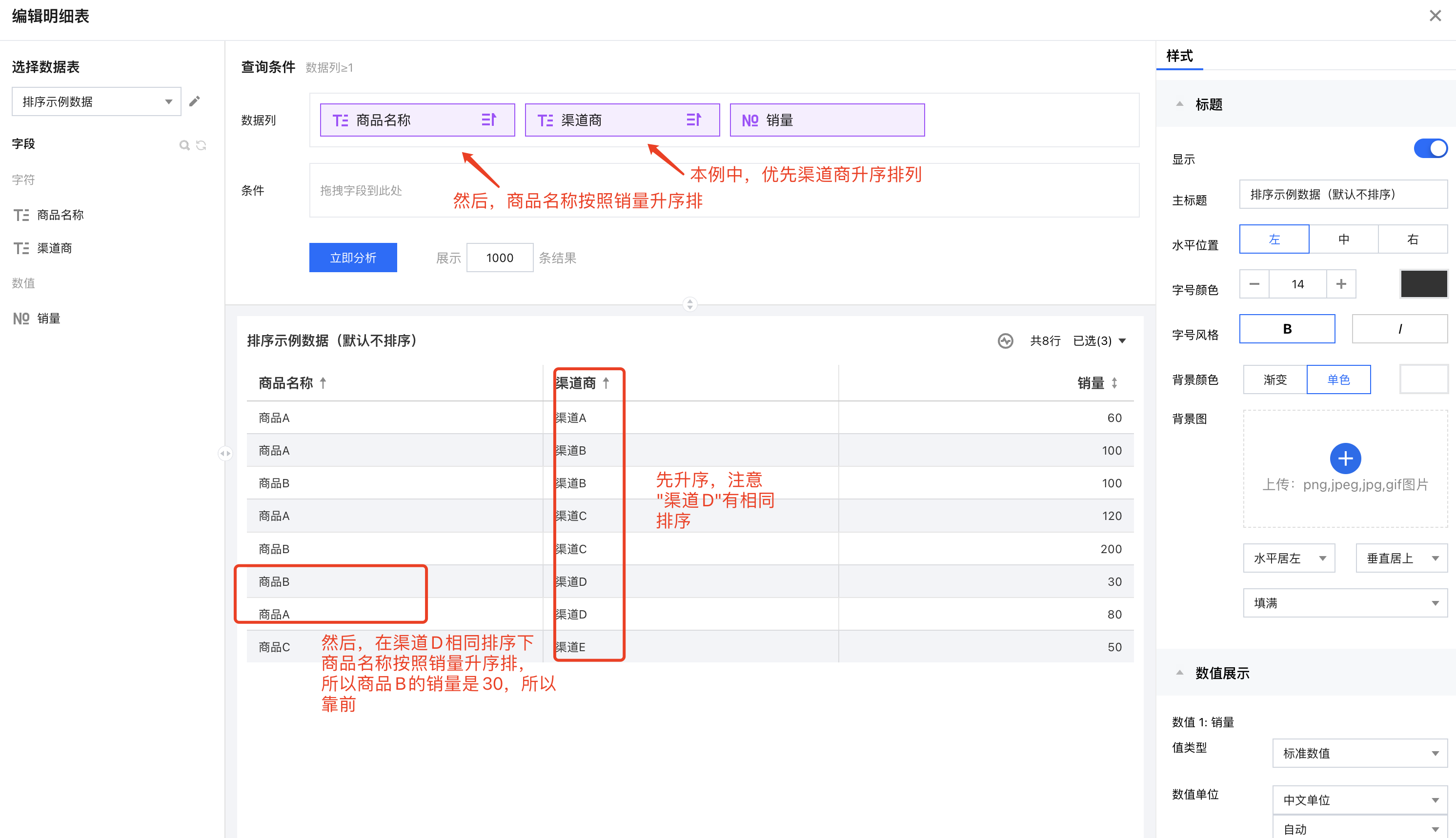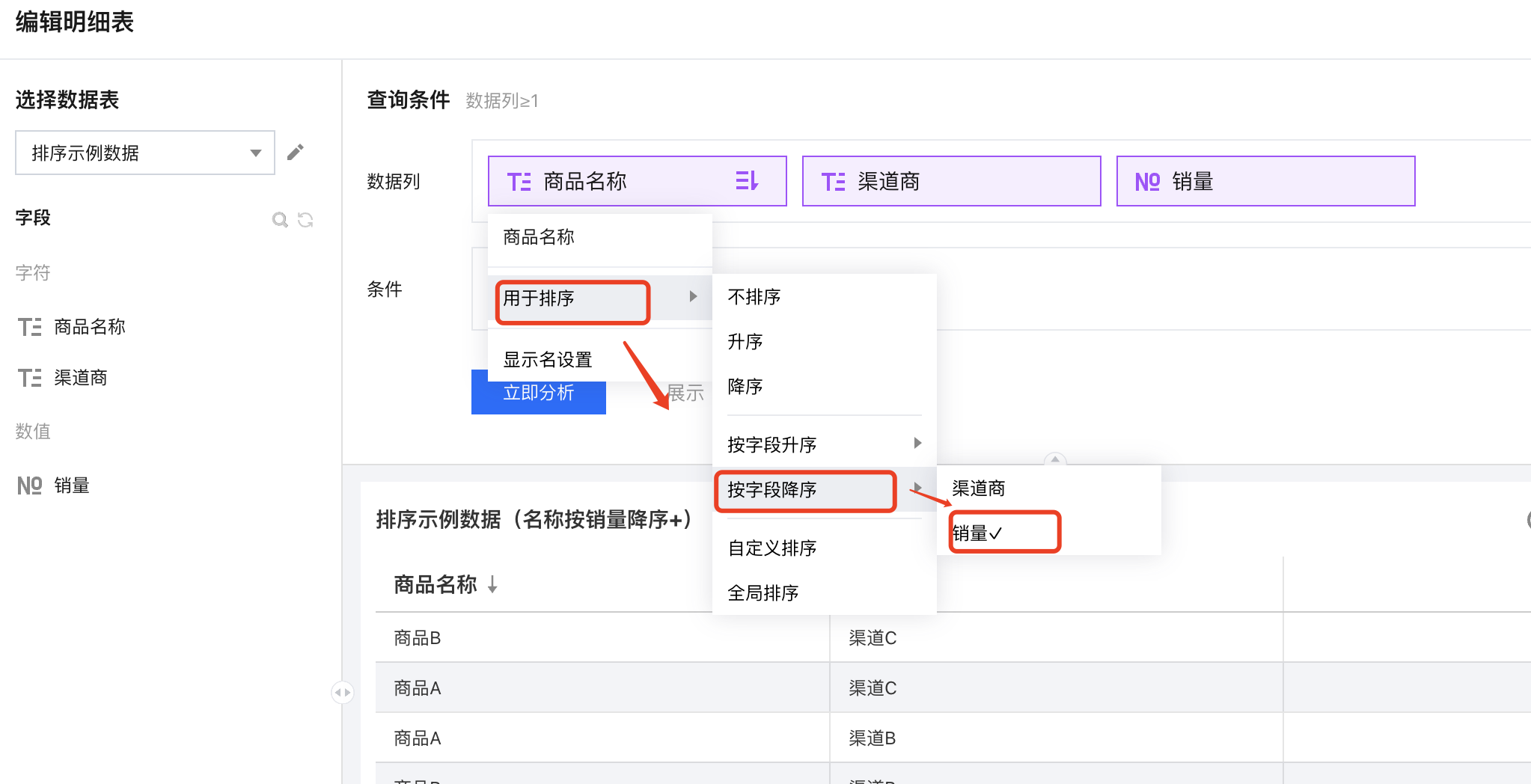 1. 创建一个明细表,引用示例底表,并设置好数据列信息; 2. 在维度字段上依次选择“排序” > “按字段降序” > “销量”; 3. 查看结果,维度列已按照数值指标进行了倒序排列了(此时效果等同于只有数值指标降序); 自定义排序
