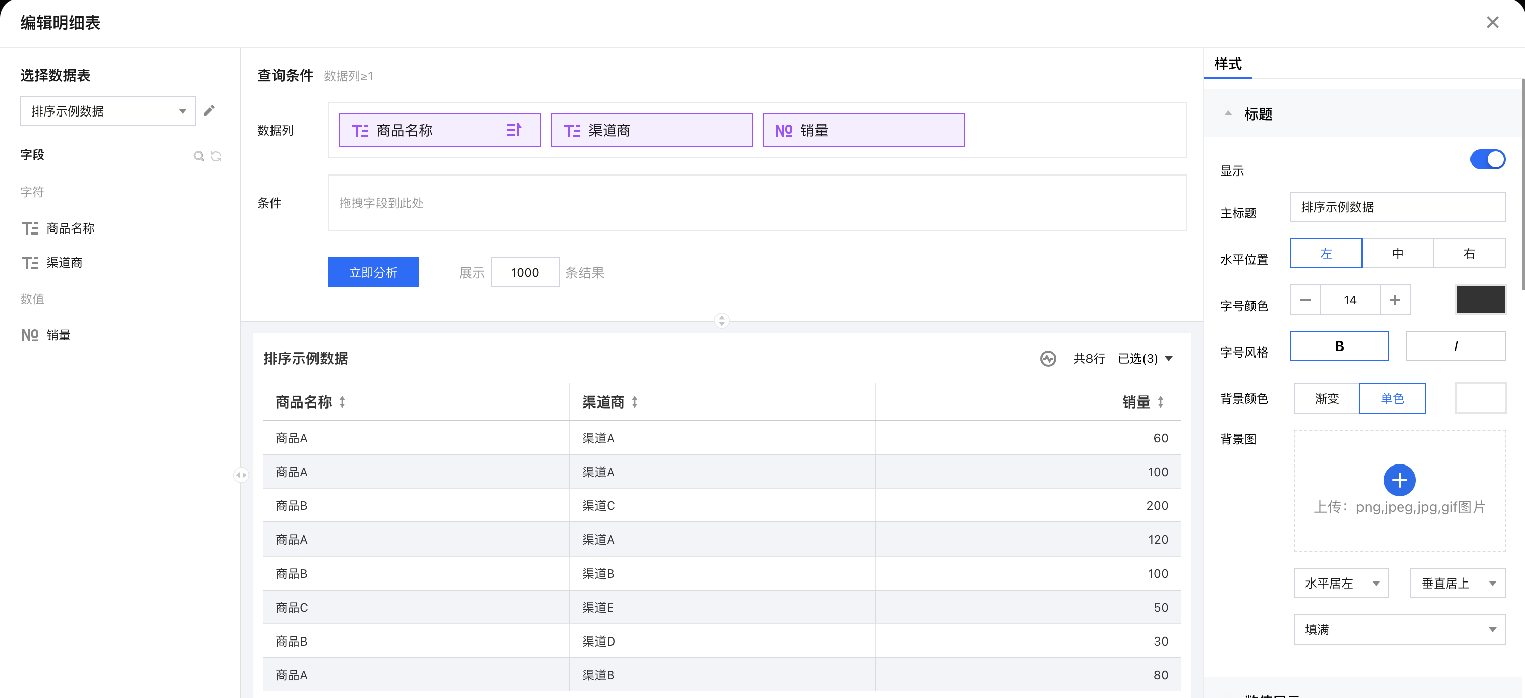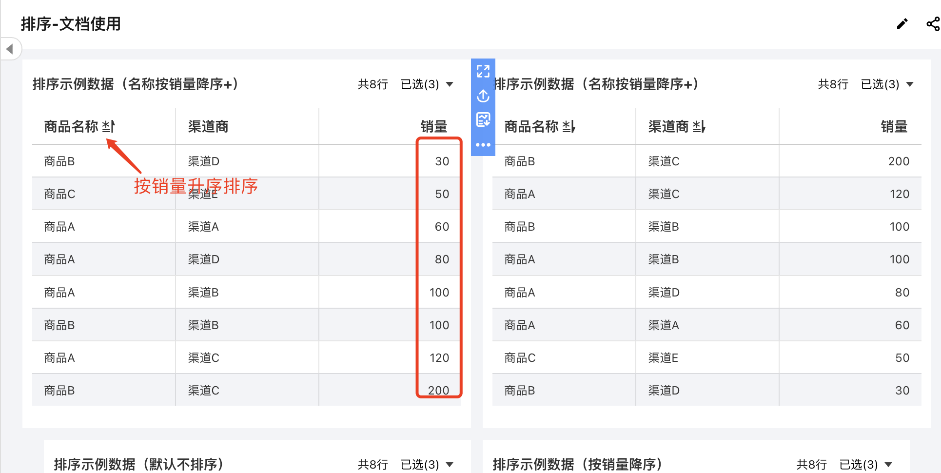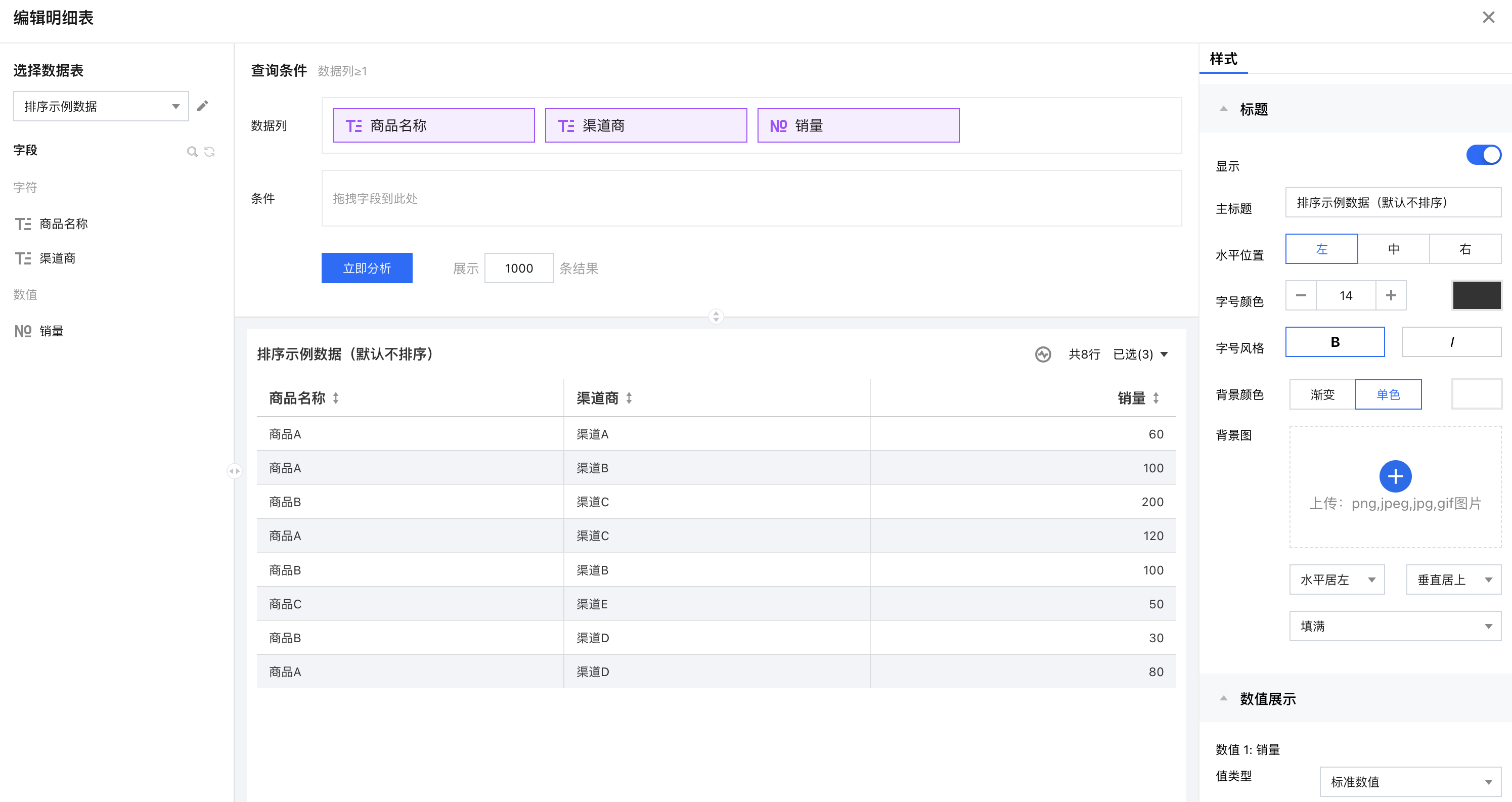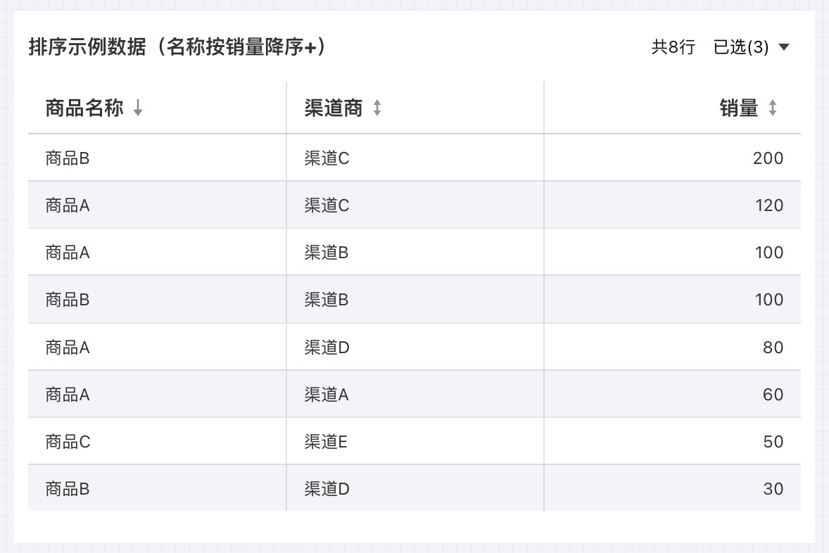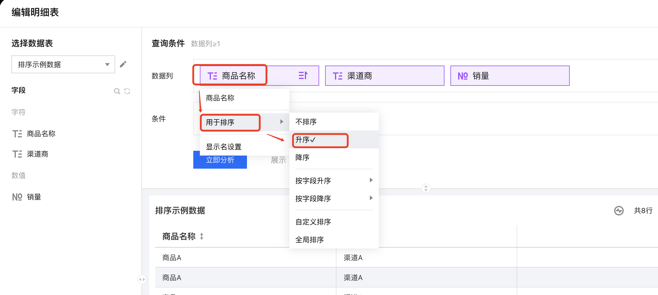1. 创建一个明细表,引用示例底表,并设置好数据列信息; 2. 在维度字段上依次选择“排序” > “按字段降序” > “销量”; 3. 查看结果,维度列已按照数值指标进行了倒序排列了(此时效果等同于只有数值指标降序); 自定义排序