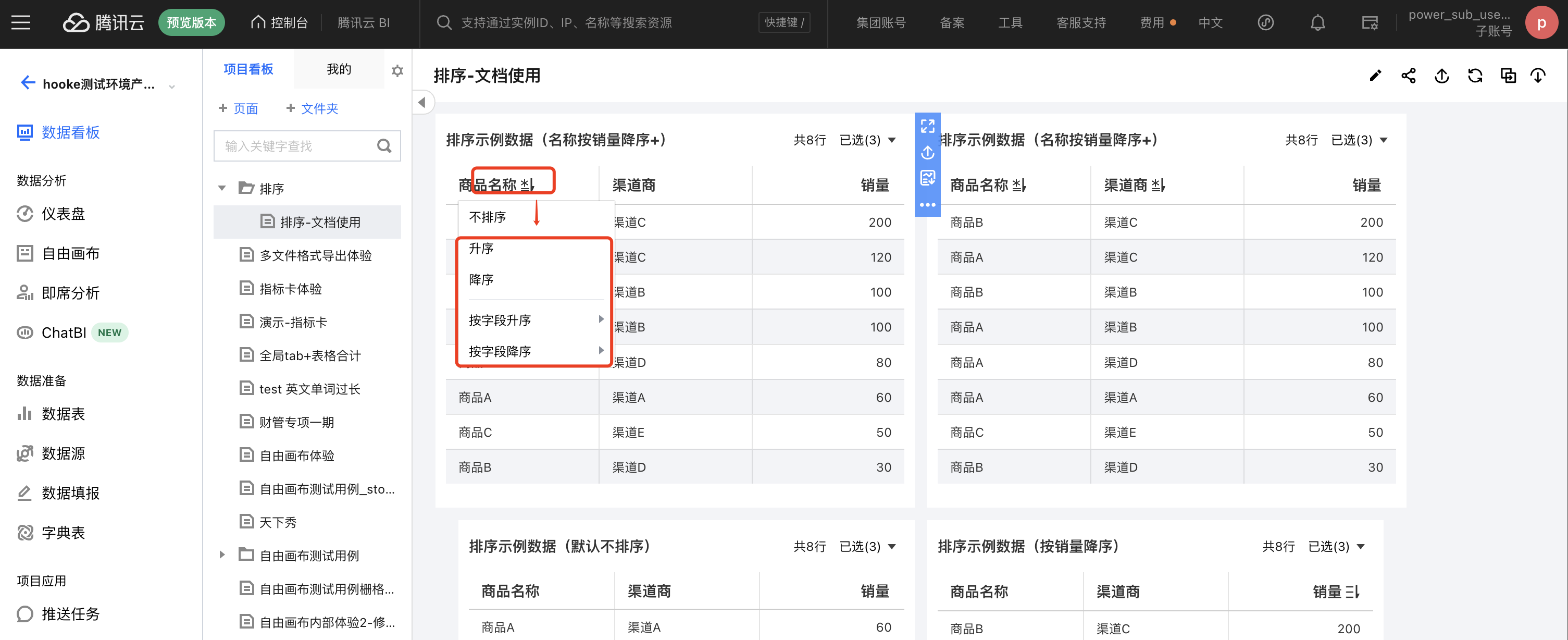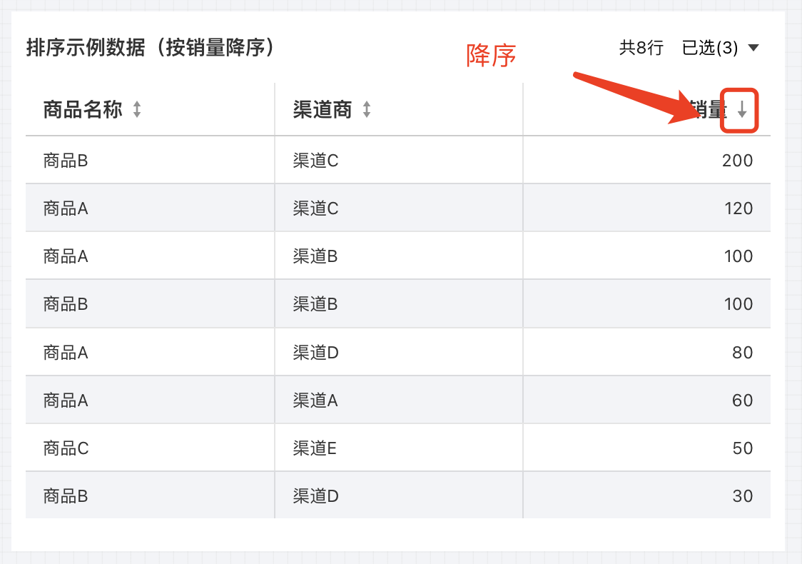 通过升降序,可以快速对当前字段进行升降序操作,如示例表,维度升降序,相当于 sql 中的 ORDER BY 该维度。