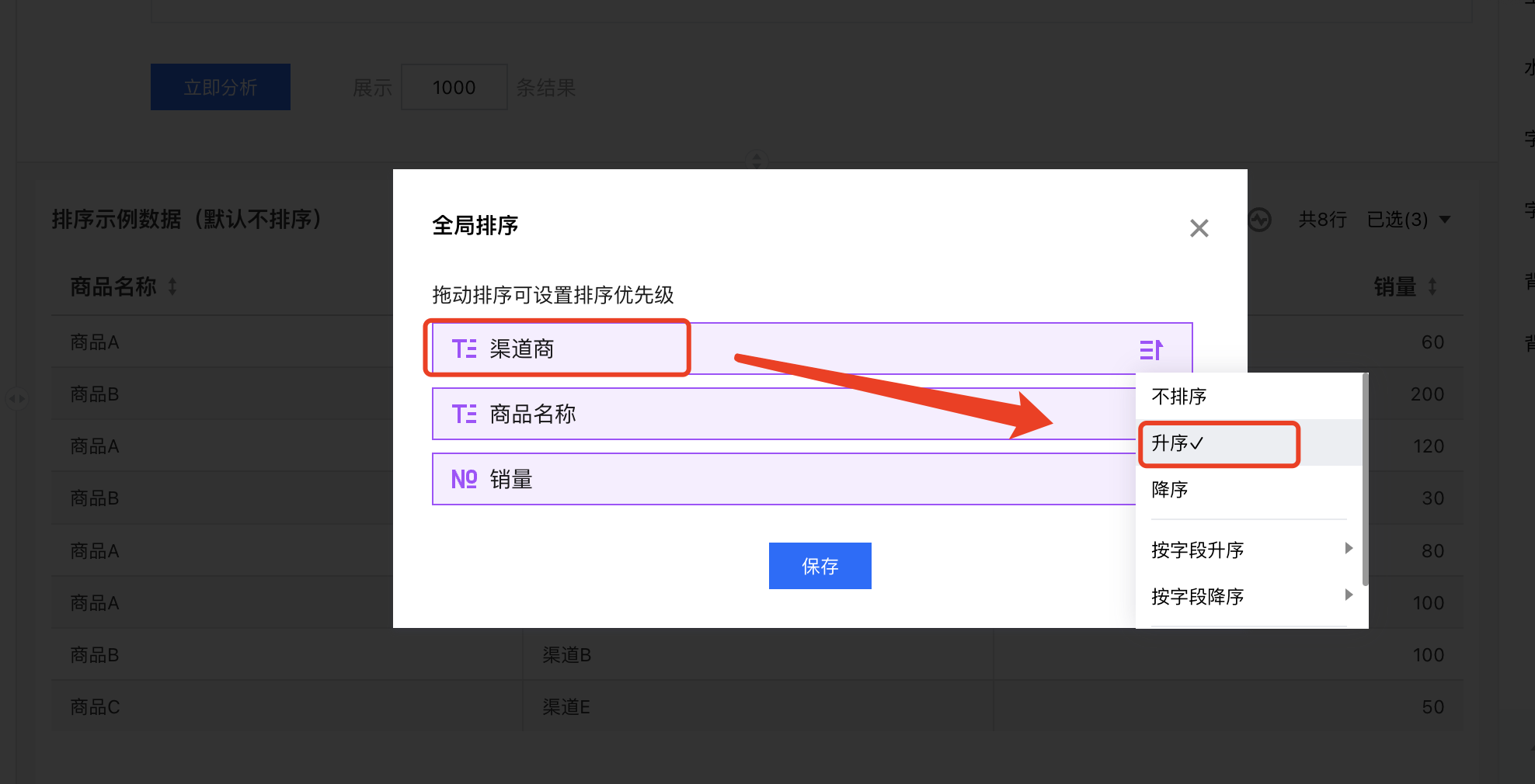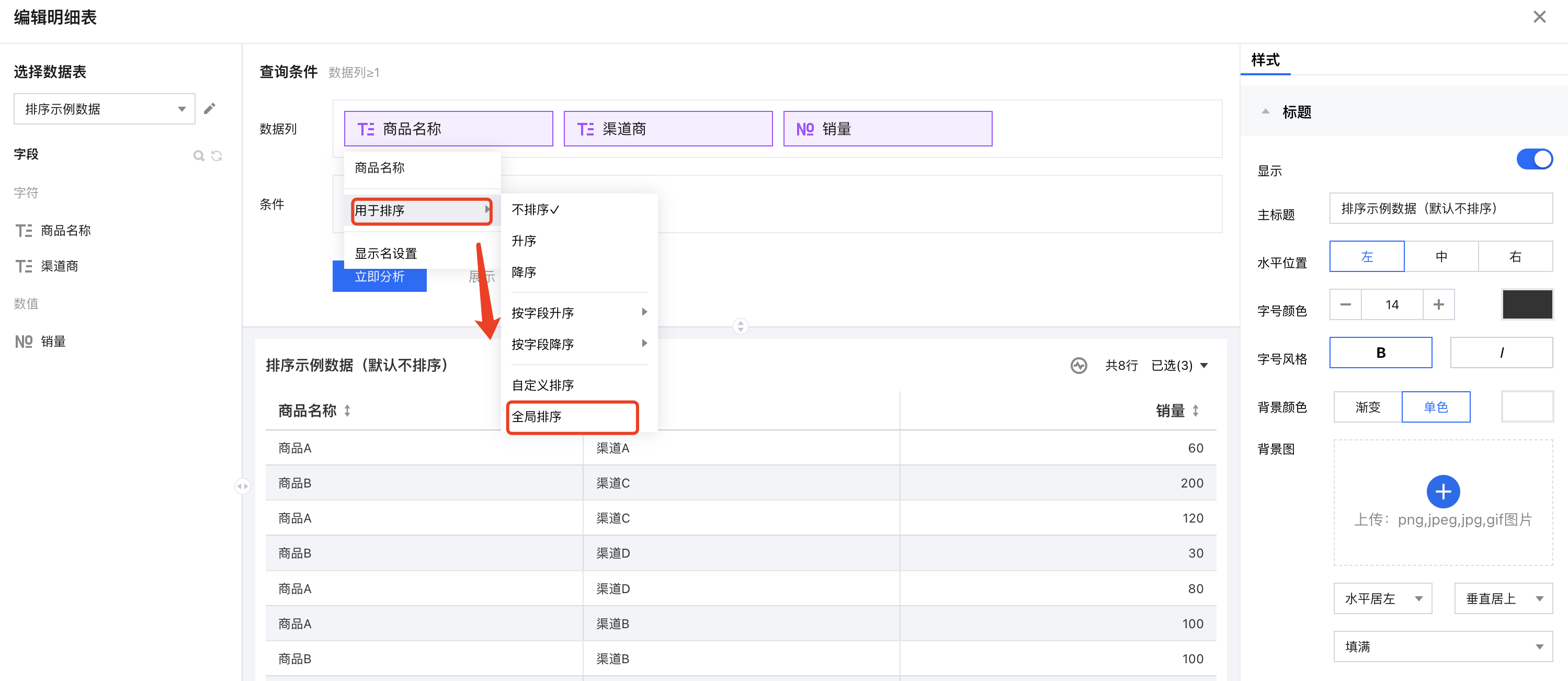 但,我们还有一种场景,同样的表格,我们希望优先按照指定的维度进行排序,然后再按照其它维度排序,这个顺序和字段的位置顺序不是一致的,这时候就需要使用到全局排序功能,全局排序决定了排序依据字段的优先级。