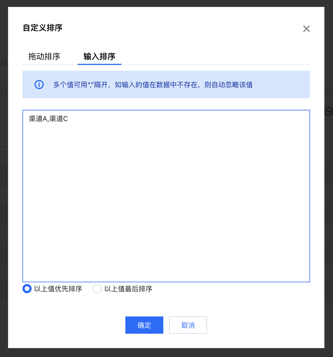 如需优先显示输入的值,剩下的值按照自然排序(即不排序),则可以勾选“以上值优先排序”;
