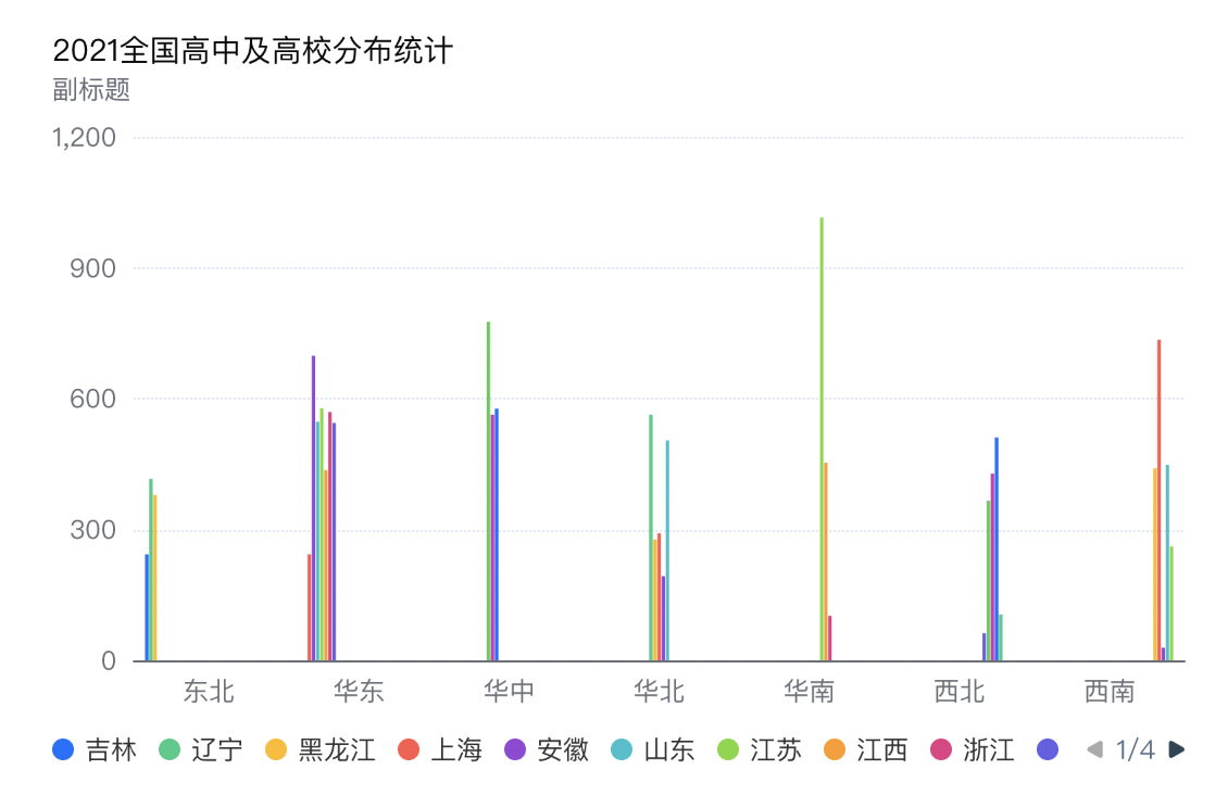 在数据分析场景中,存在需要对维度进行分组的情况,例如选择两个分析维度,希望图表展示为同一维度的子维度为一个组进行展示,以便了解一个维度下的不同子维度的数值表现。对维度进行分组展示,则需要使用维度次轴功能,具体操作如下: