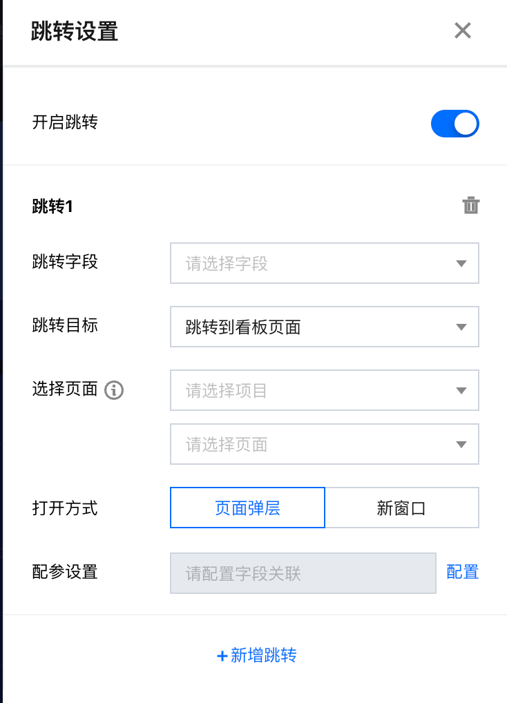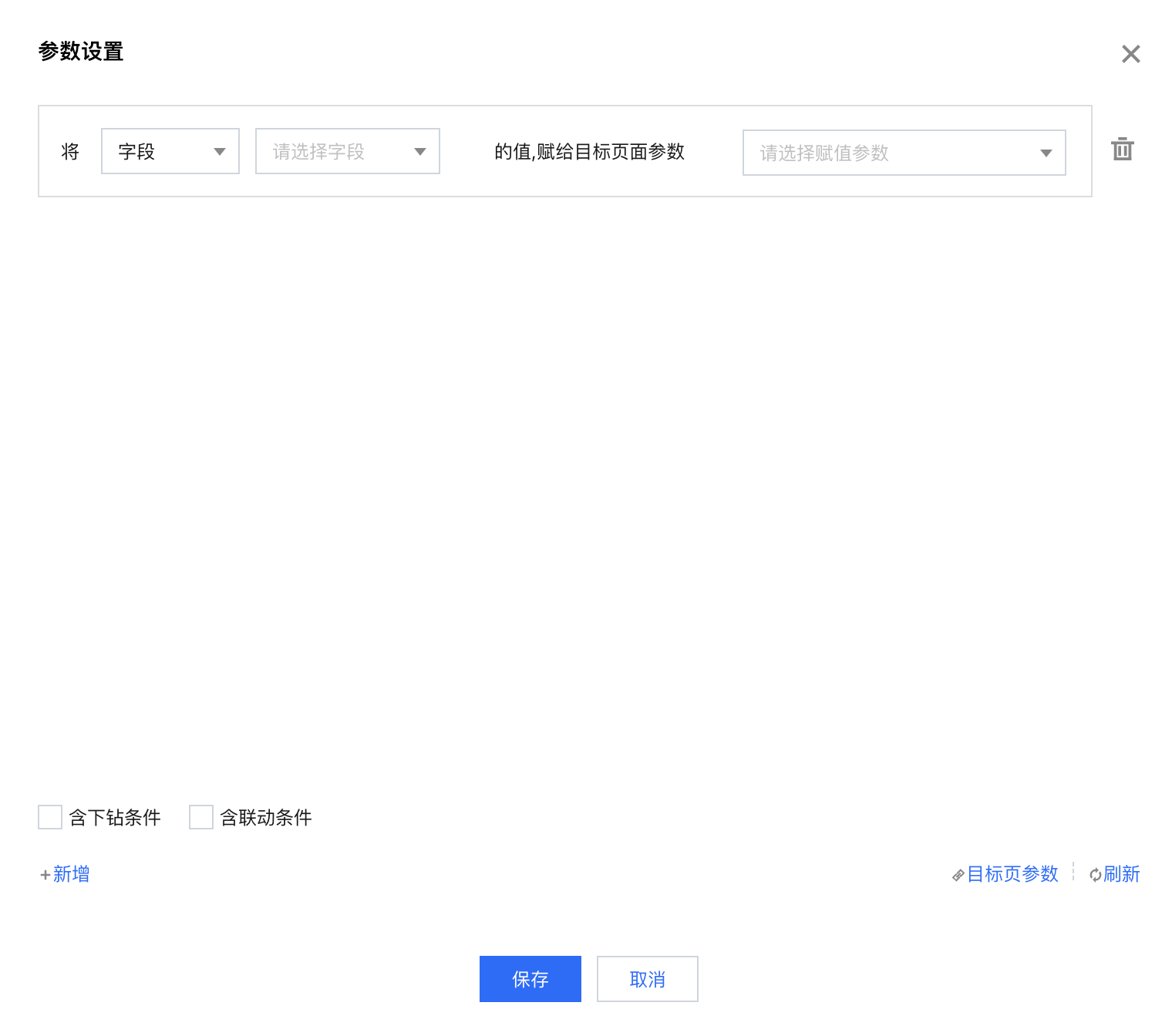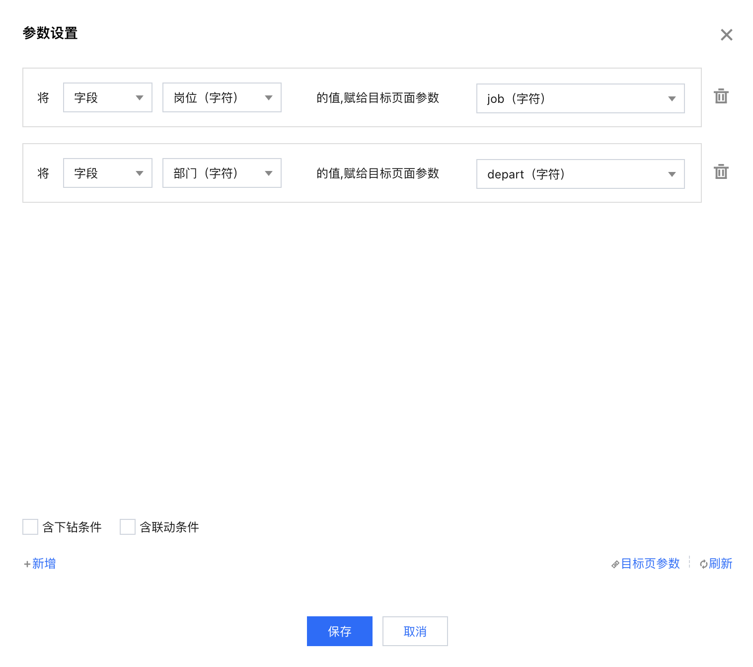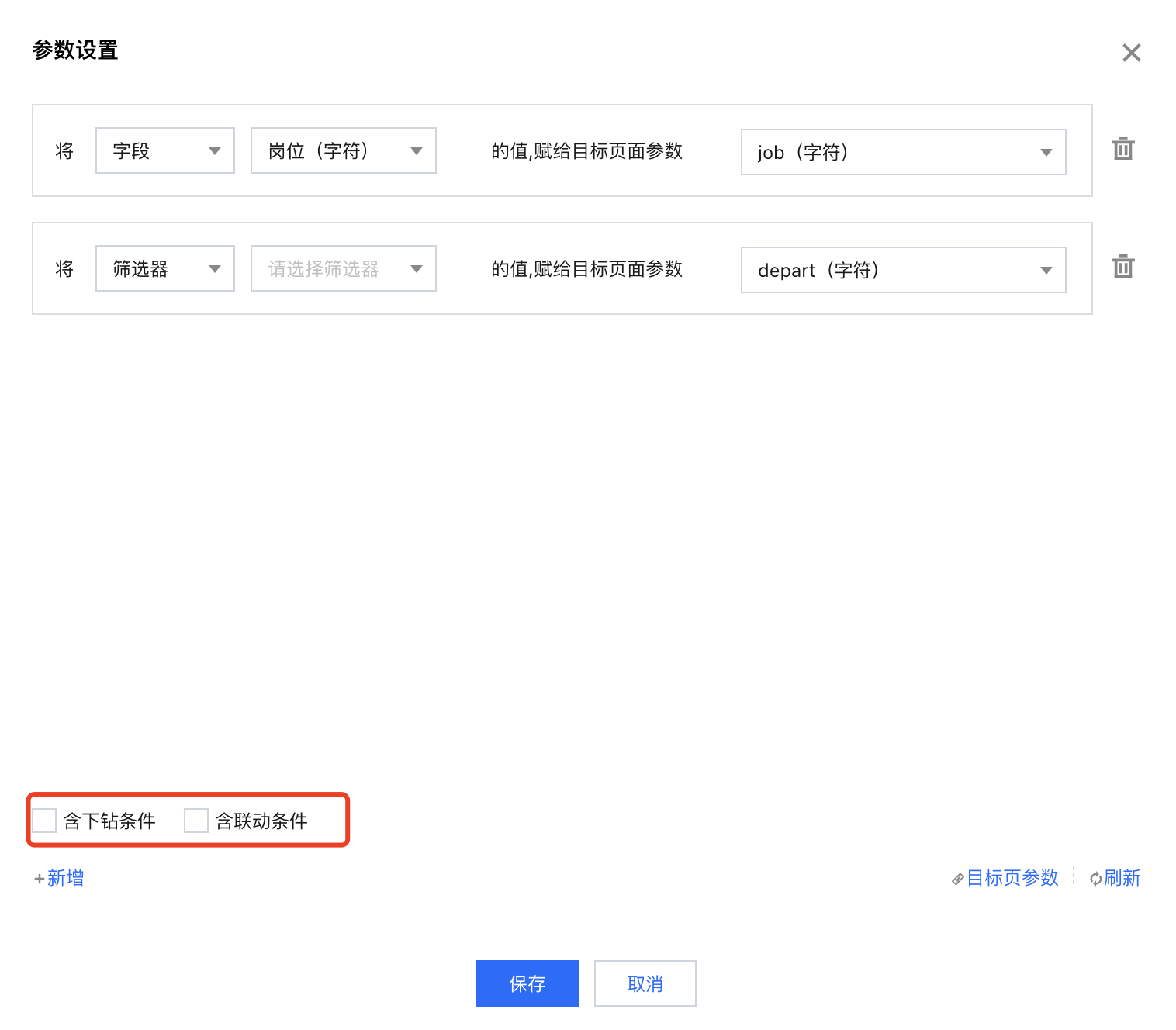 含联动条件 | 需要先设置“将字段**的值,赋予目标页面参数**”,否则即使勾选联动条件也不生效。 | 示例:A图表“部门”(如“产品部”)联动B图表“部门”字段,但是B图表并没有将“部门”字段作为维度字段,当点击B图表时,选择【将字段“部门”的值,赋给目标页参数“dpt”】,且勾选“含联动条件”,则结果会筛选出dpt=“产品部”的所有结果。 未勾选结果:结果会筛选出dpt为空的所有结果。 |
