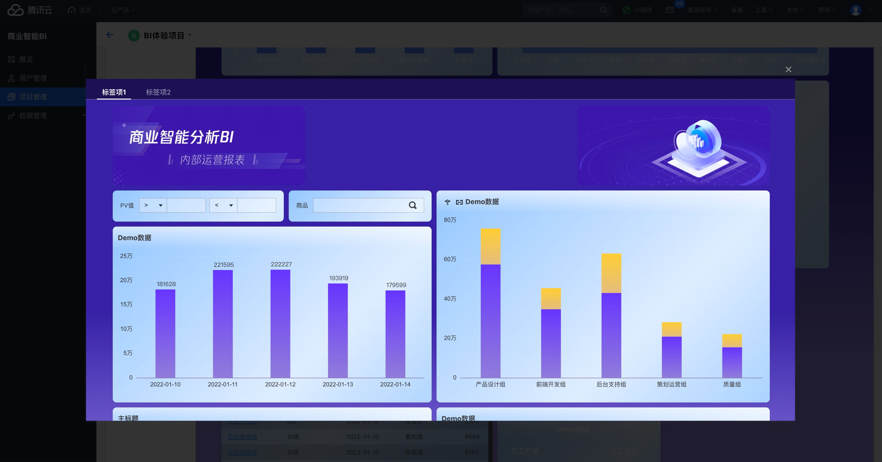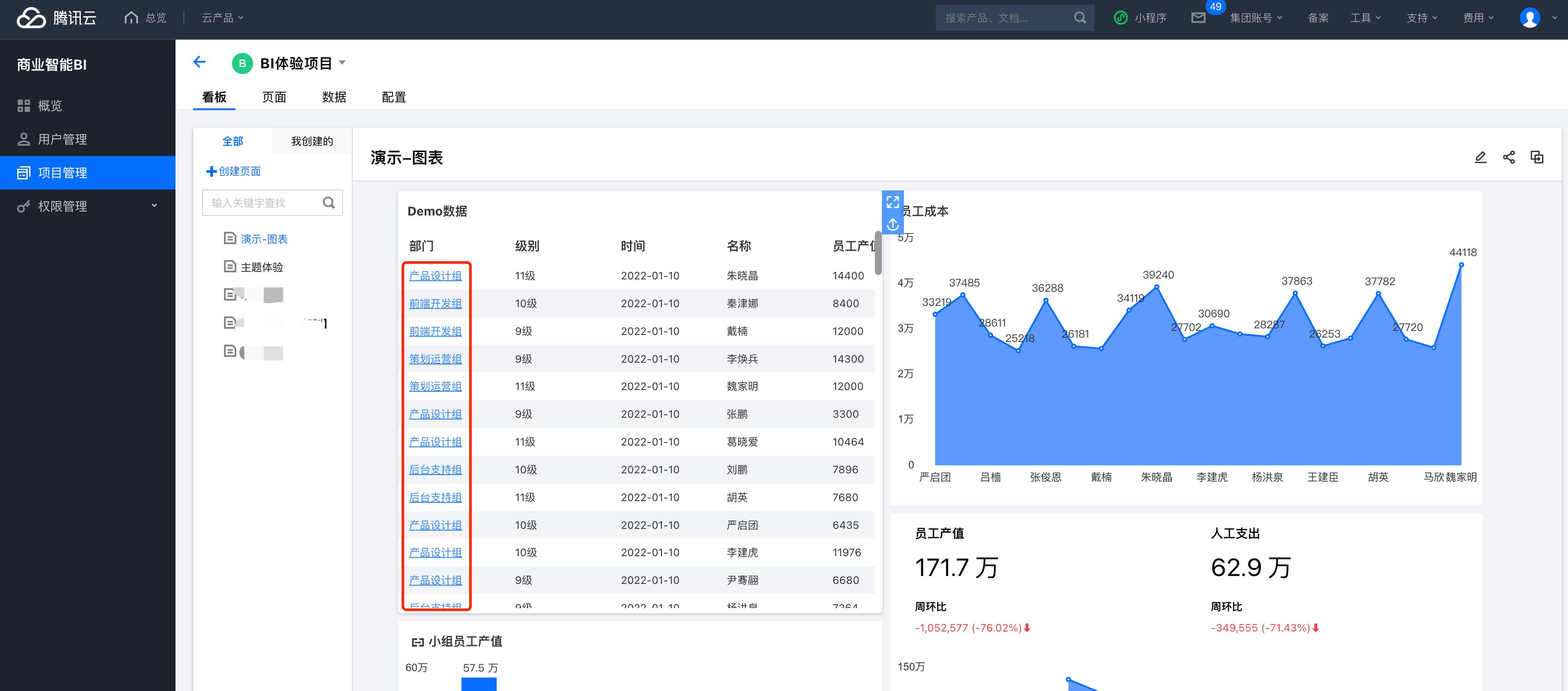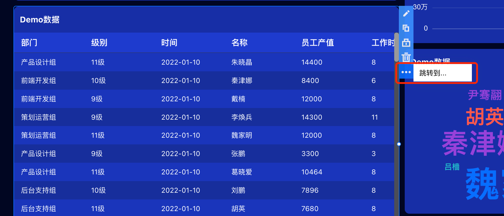 变量 | 选择页面变量、项目及系统变量 | 示例:点击部门"产品部",跳转到另一个页面B,使页面B的"employee"参数等于页面变量“epl”(产品部最佳员工),使页面呈现最佳员工的数据筛选结果。