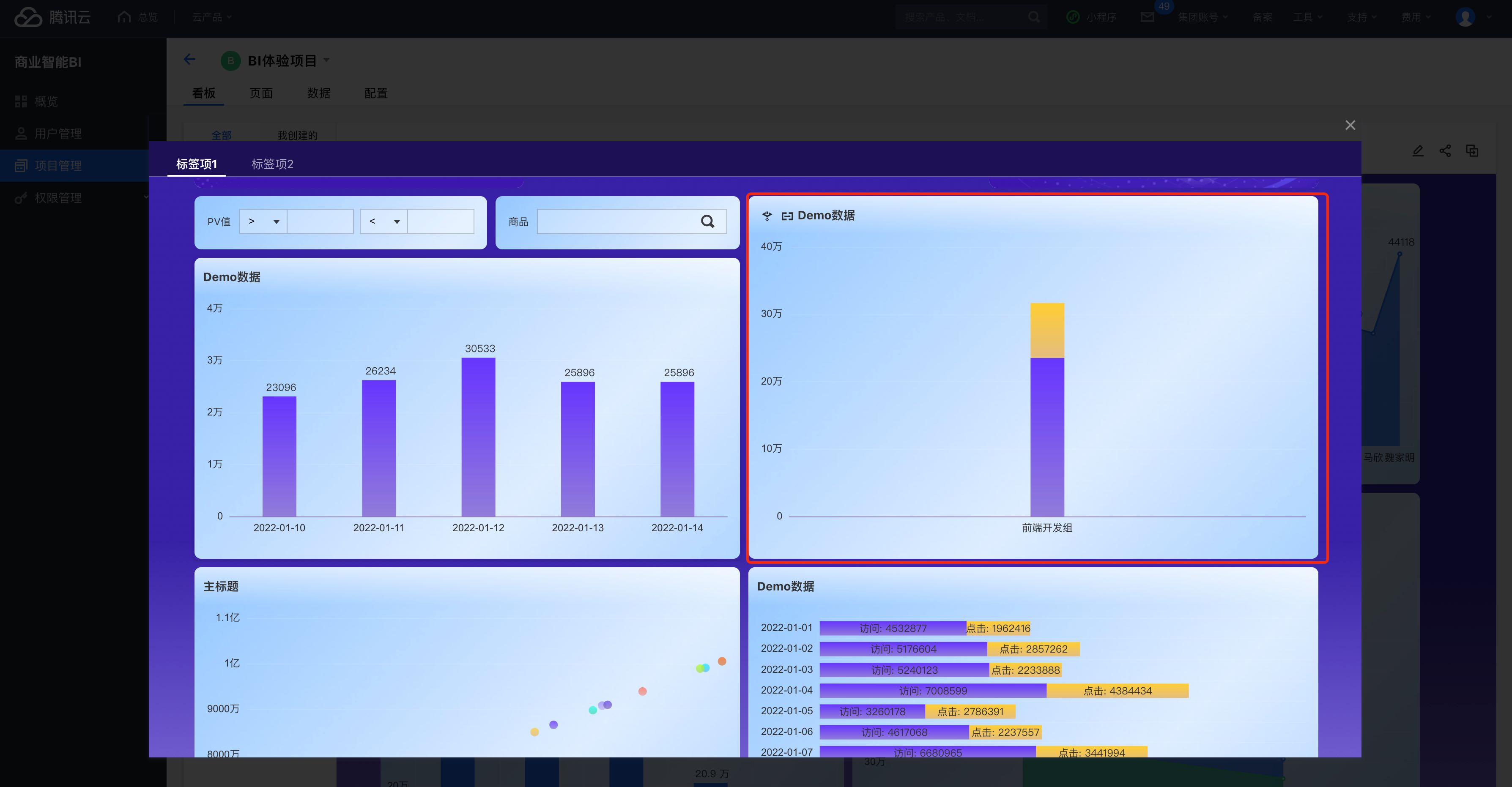 字段 | 选择当前图表引用的数据表字段 | 示例:点击部门"产品部",跳转到另一个页面B,使页面B的“dpt”参数等于“产品部”,使页面B呈现部门等于“产品部”筛选结果。 说明: 1. 如果当前图表没有维度“部门”字段,则无法获取到“部门”值,默认为空,即dpt参数值为空(不过滤); 2. 如果当前图表没有维度“部门”字段,但是该组件被其他组件给联动了(以“部门”字段联动),且勾选了“含联动条件”,那么,传参时,会把联动的部门值作为条件传递给页面参数。 |