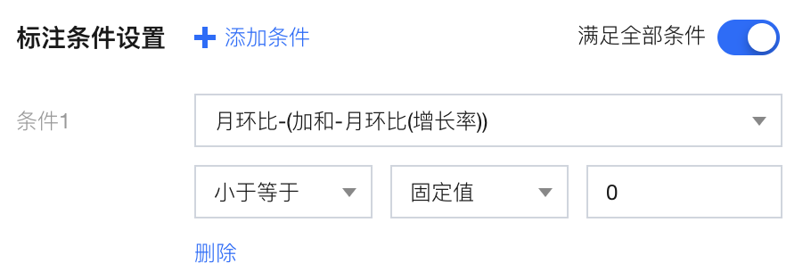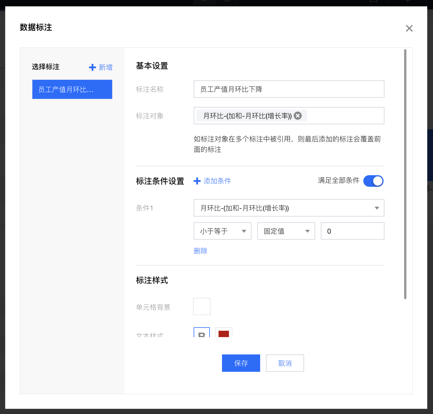 多个标注作用在一个字段(单元格)上,则以最新创建的标注为最高优先级,如设置了两条标注,同时作用在“月环比”上,第一条标注定义为:当“月环比>0”时,“月环比”字段标注红色;第二条标注定义为:当“月环比>平均值”时,“月环比”字段标注为蓝色,以上定义,两个条件都满足的单元格将被标注成蓝色。