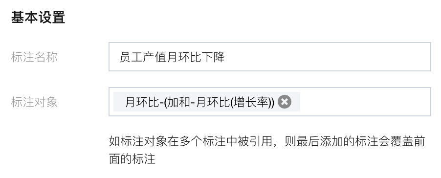 配置标注的基本信息,包括标注名称和标注对象,其中,标注对象指满足标注条件后,我们将对哪部分元素进行特殊样式展示,建议选择条件对应的指标字段,用户也可以选择其他字段。