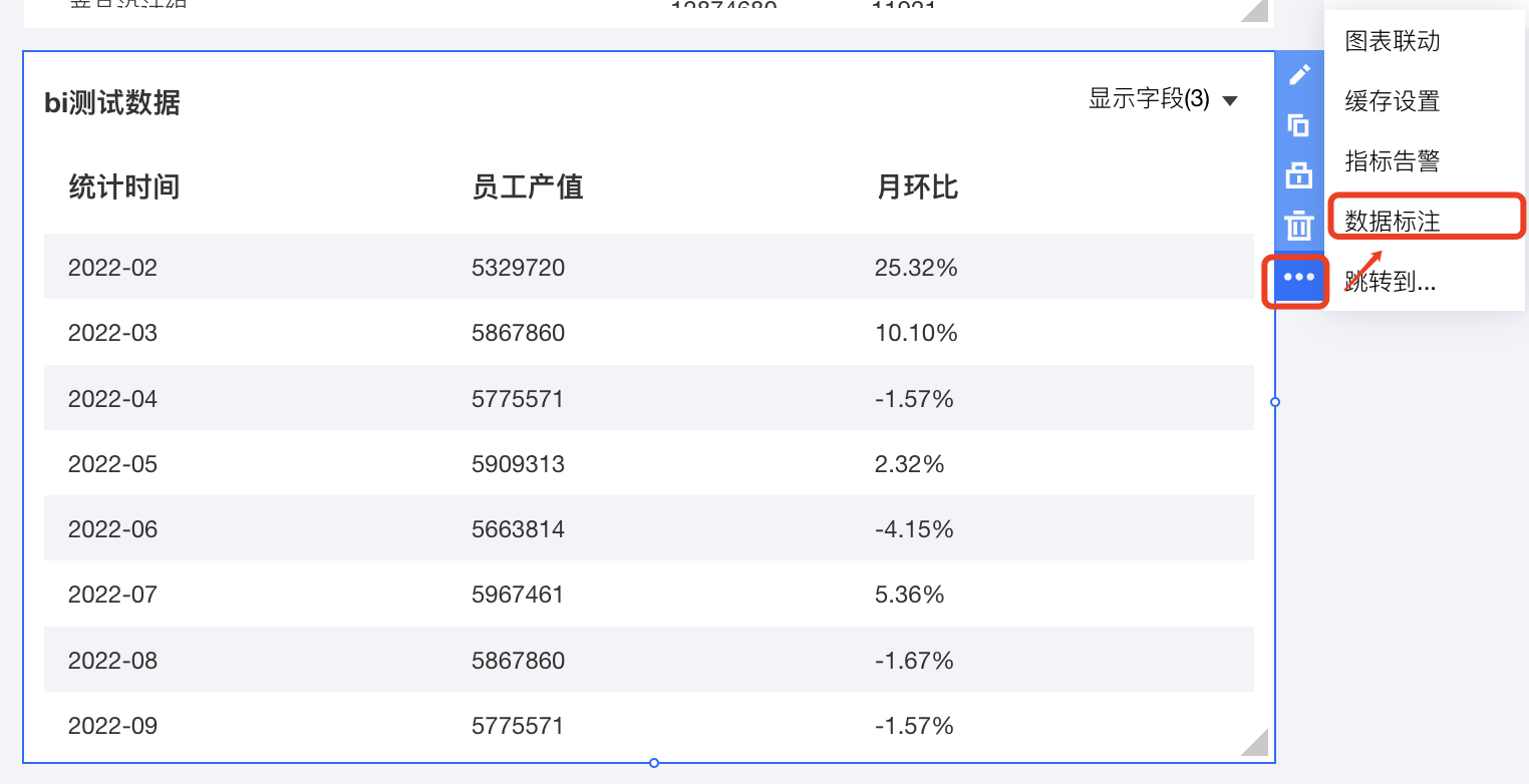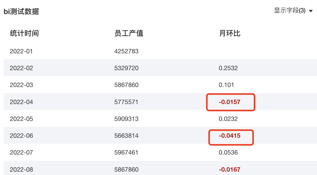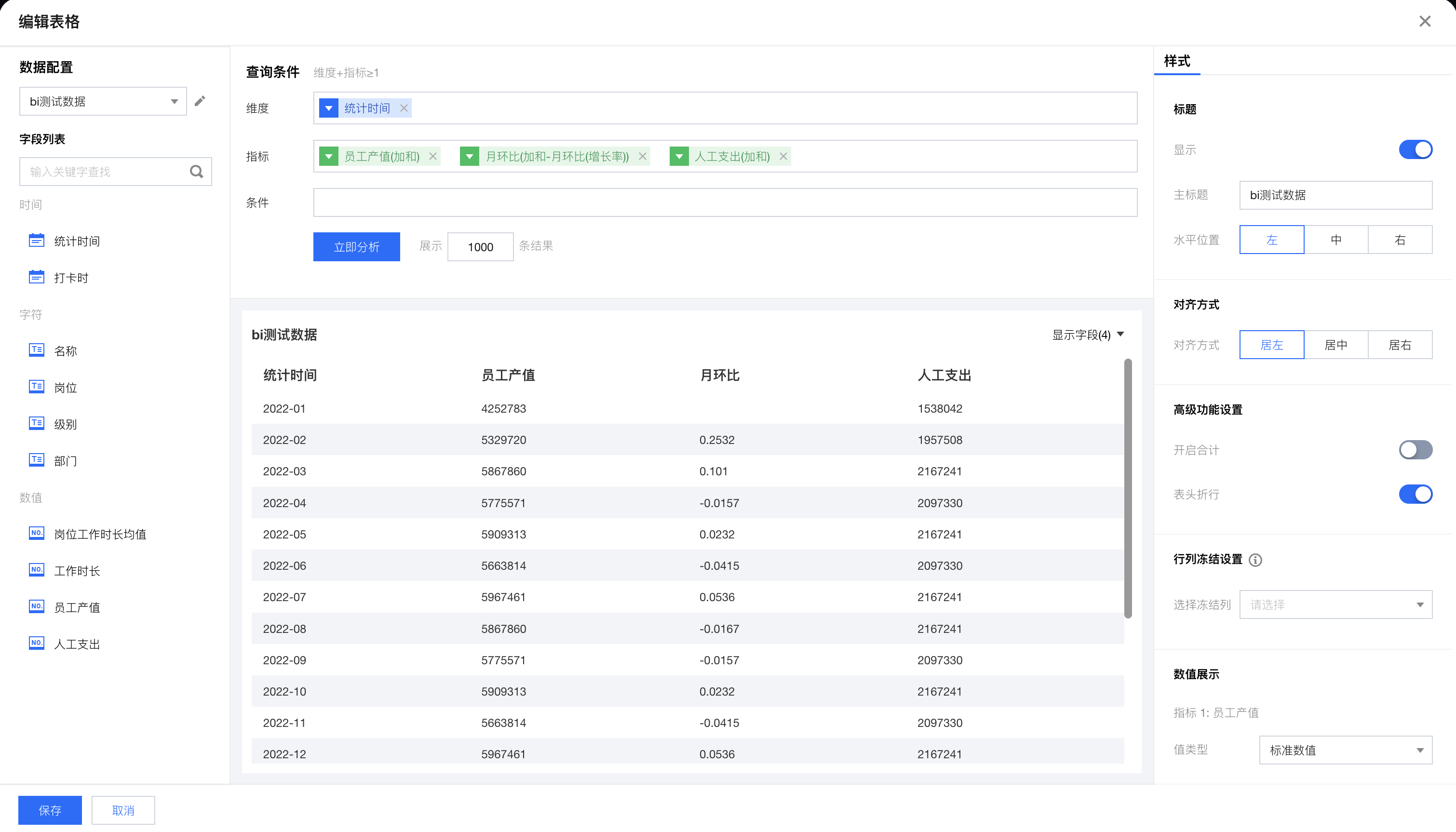 向画布拖入表格组件,设置维度为“统计时间”、指标为“员工产值”、“月环比”。其中“月环比”是通过拖入“员工产值”并进行快捷计算(同环比-环比-月环比-增长率)出来的结果,经过修改显示名得到。
