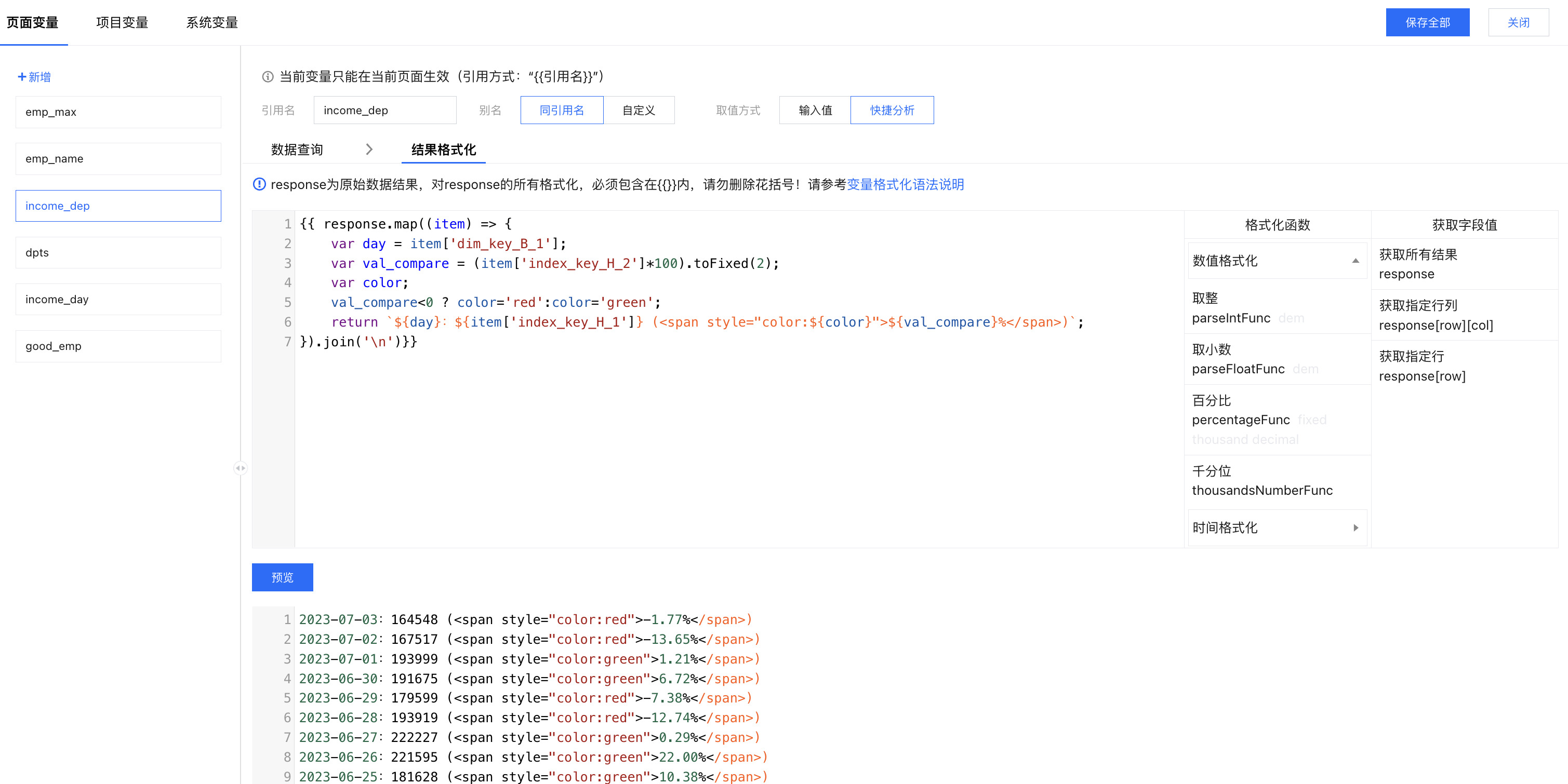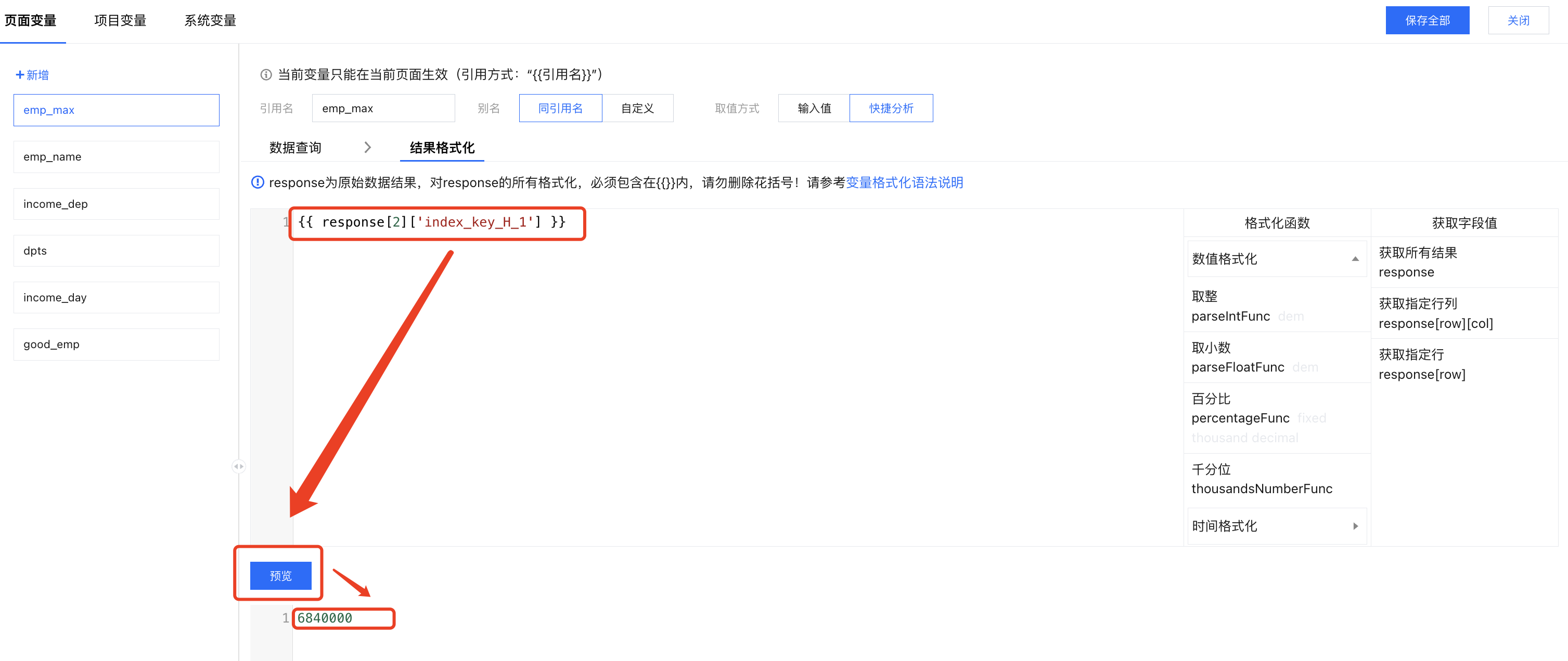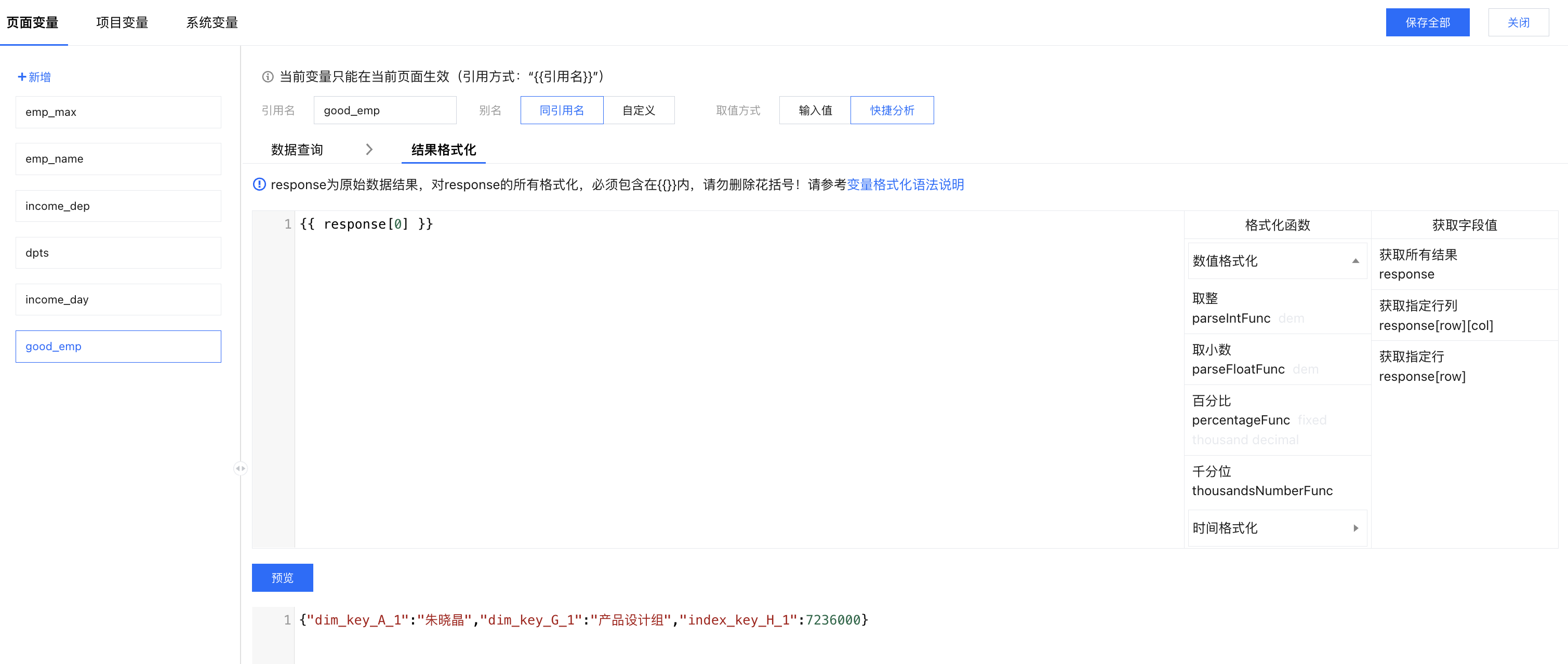 结果格式化:打开结果格式化面板,通过 "response[0]['index_key_H_1']"获得员工的产值(此时产值为7236000);