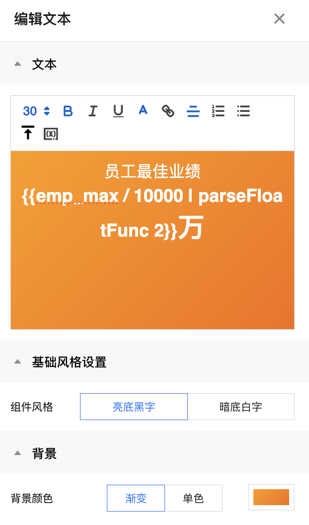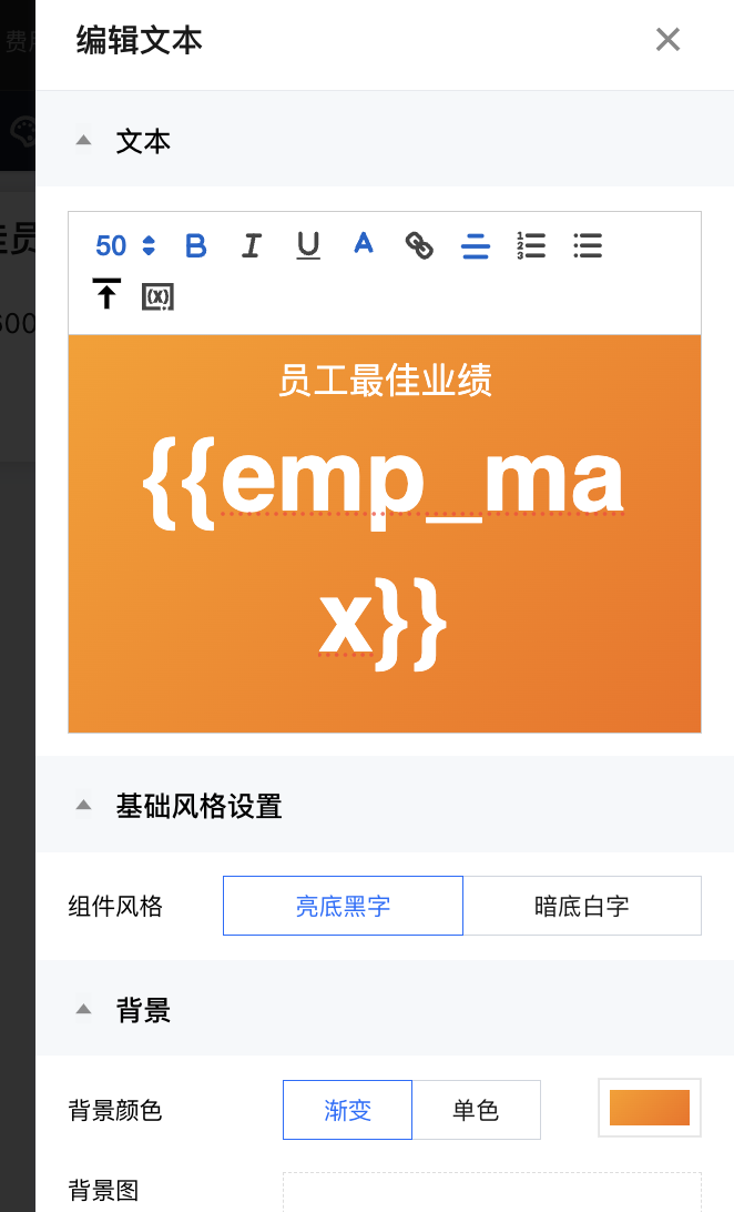 画布中添加一个文本组件:设置对应的样式,其中数值部分用变量引用“{{emp_max}}”;