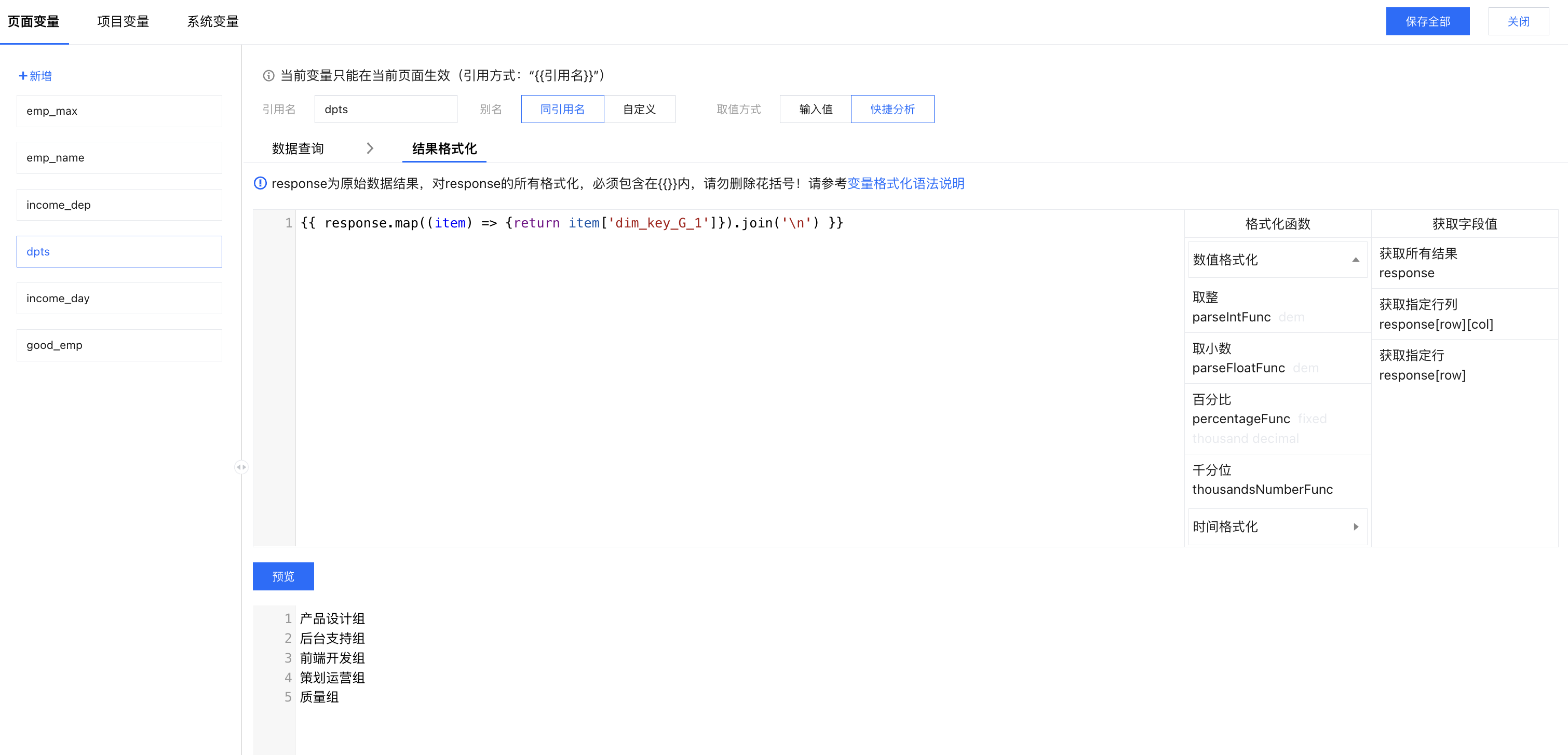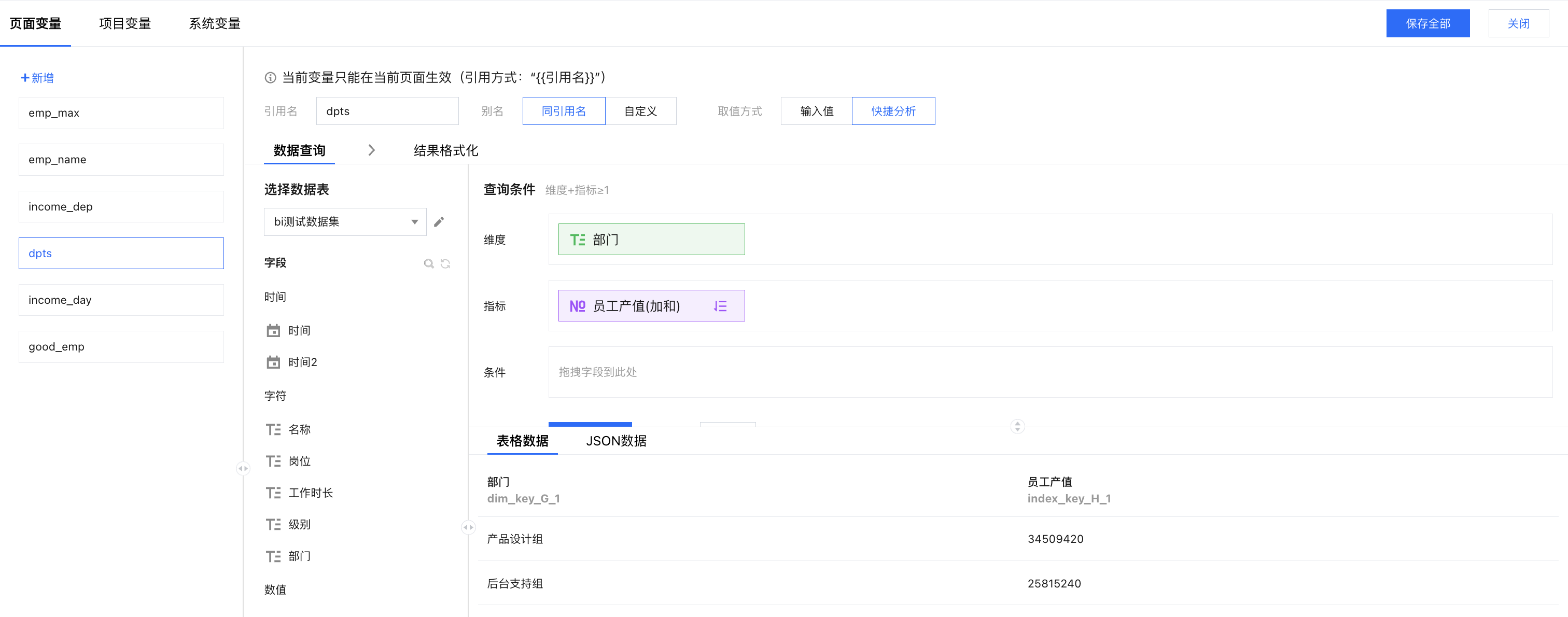 添加变量:打开变量面板,新增一个“dpts”页面变量,设置维度和指标;其中产值进行倒序排列,以便获取部门排名;