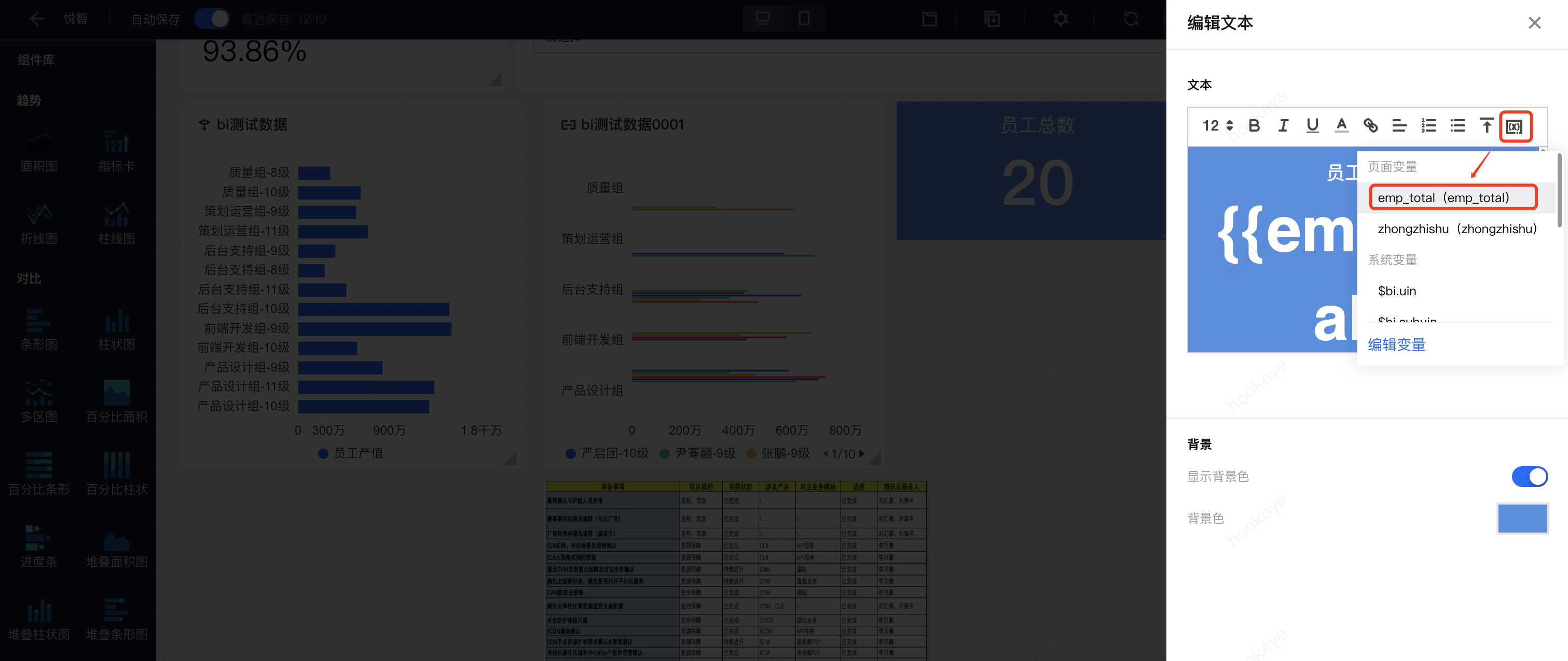 变量将可以用在多种场景,如在文本组件中插入变量、在图表标题中插入变量等。变量的引用使用双花括号包裹,如“{{emp_total}}”。