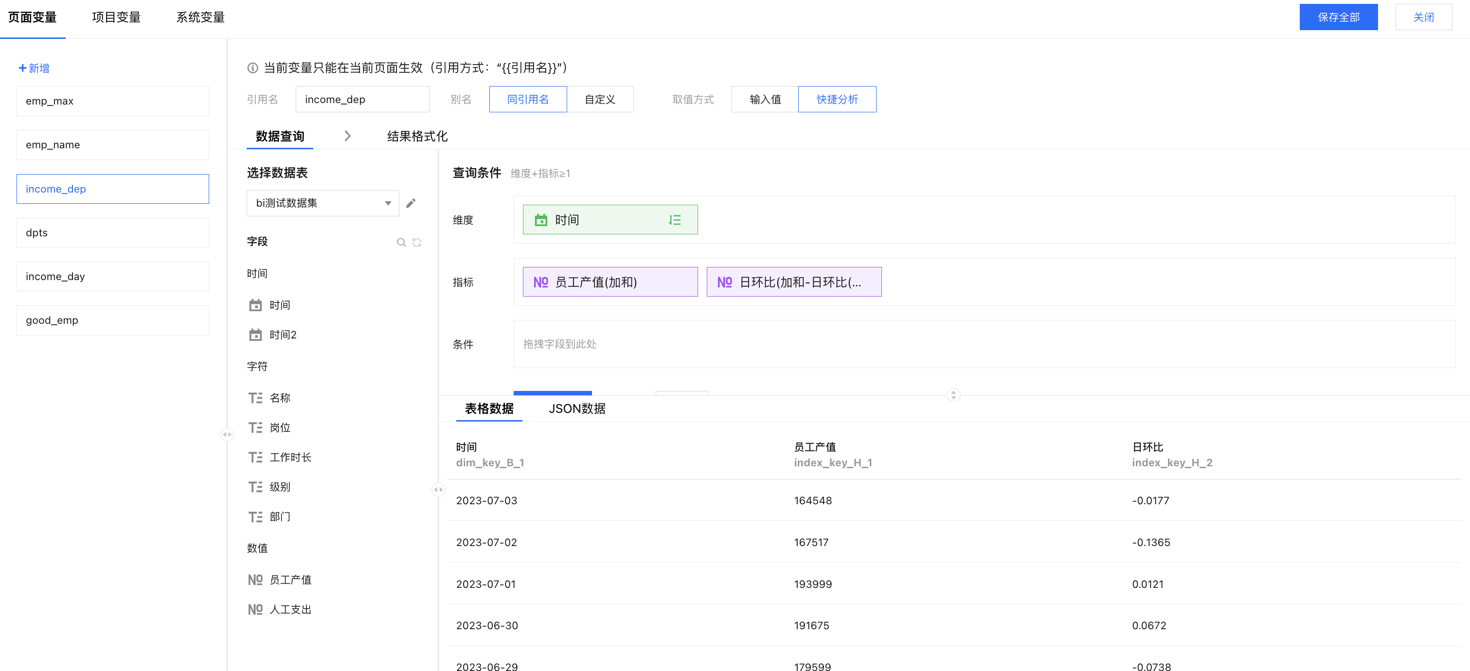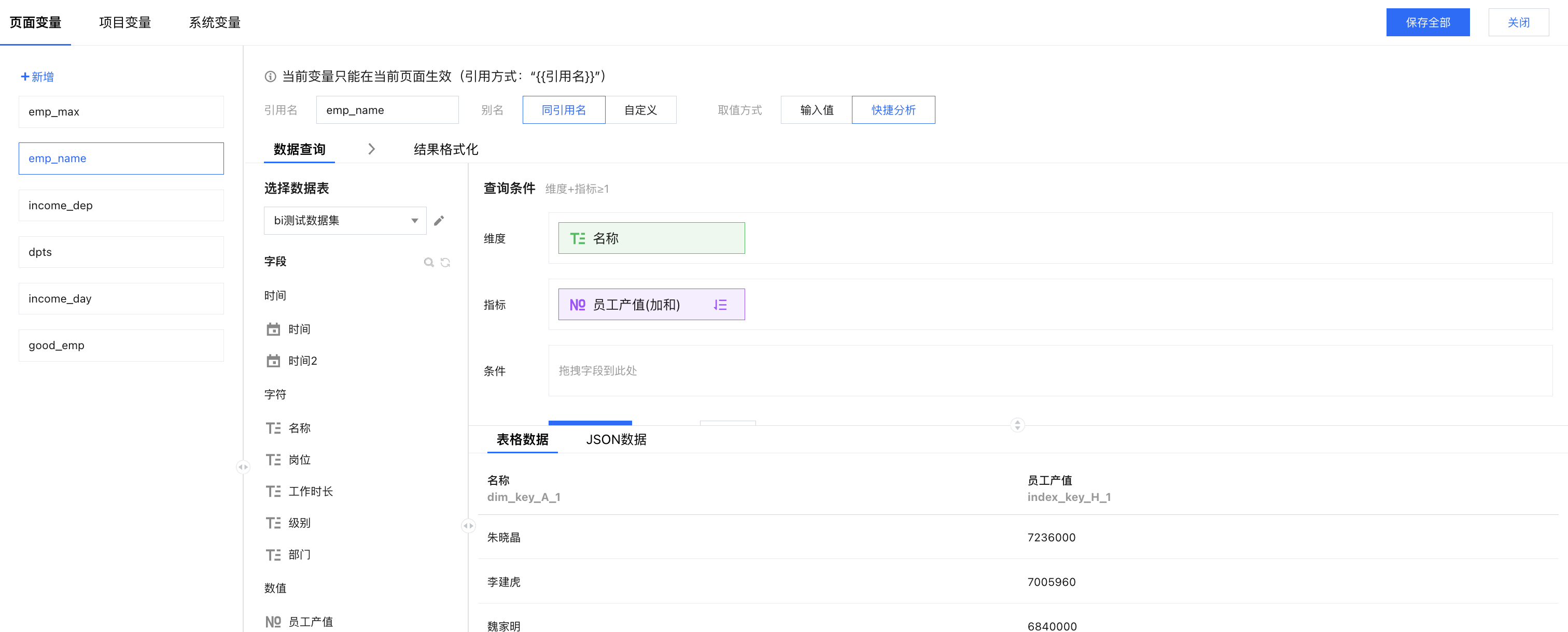 添加变量:打开变量面板,新增一个“emp_name”页面变量,设置维度和指标;其中产值进行倒序排列,以便获取产值最高的员工;