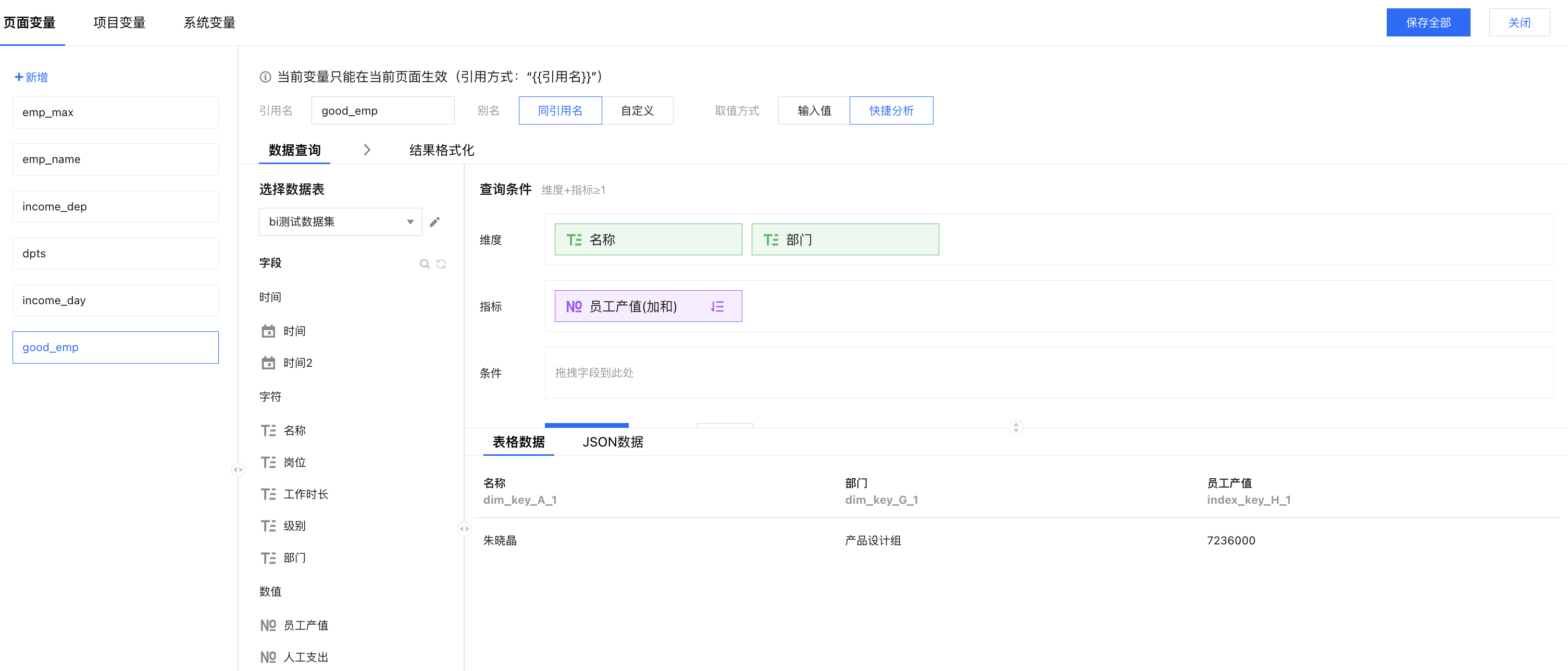 添加变量:打开变量面板,新增一个“good_emp”页面变量,设置维度和指标;其中产值设置为倒序排列,结果取1条;
