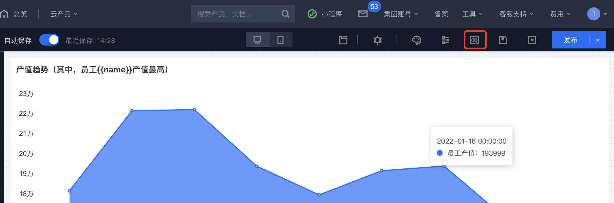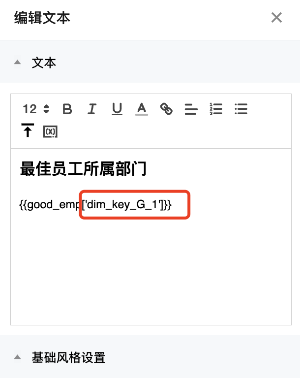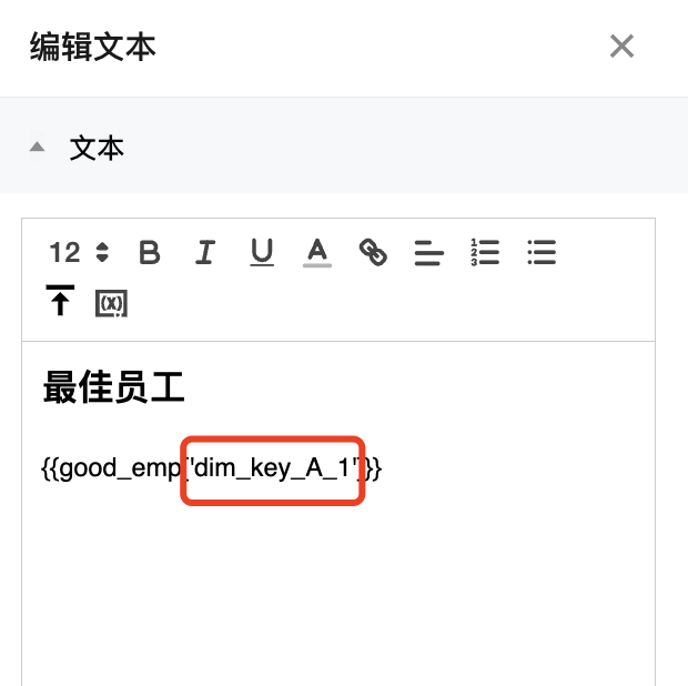 在业务场景中,需要将一个分析结果放到文本组件中(如日报场景)或者将数据提点放到组件标题中(如提炼当前统计周期的最佳员工名称),通过变量,用户可以在组件中引用数据分析结果。