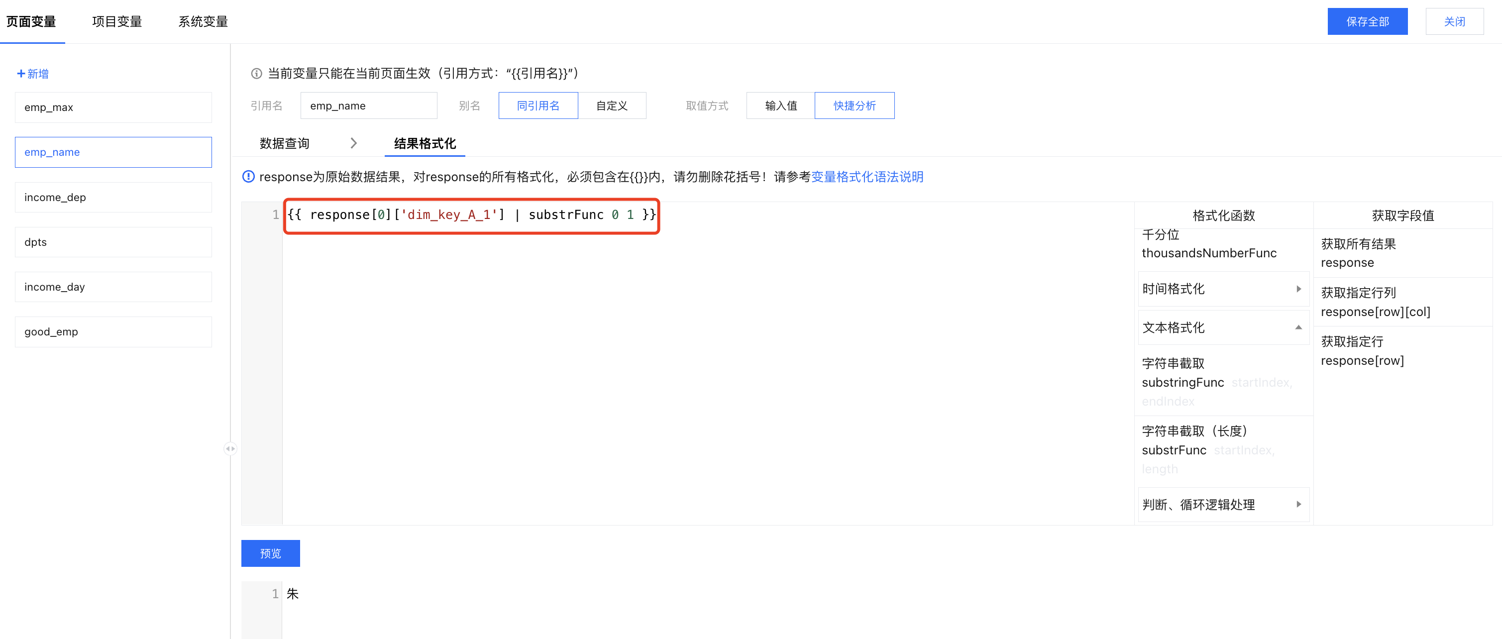 结果格式化:打开结果格式化面板,先通过 "response[0]['dim_key_A_1']"获得员工名称,在该值后面插入 格式化函数 “substrFunc”, 获取从第一个字母开始,取1个字(即姓);