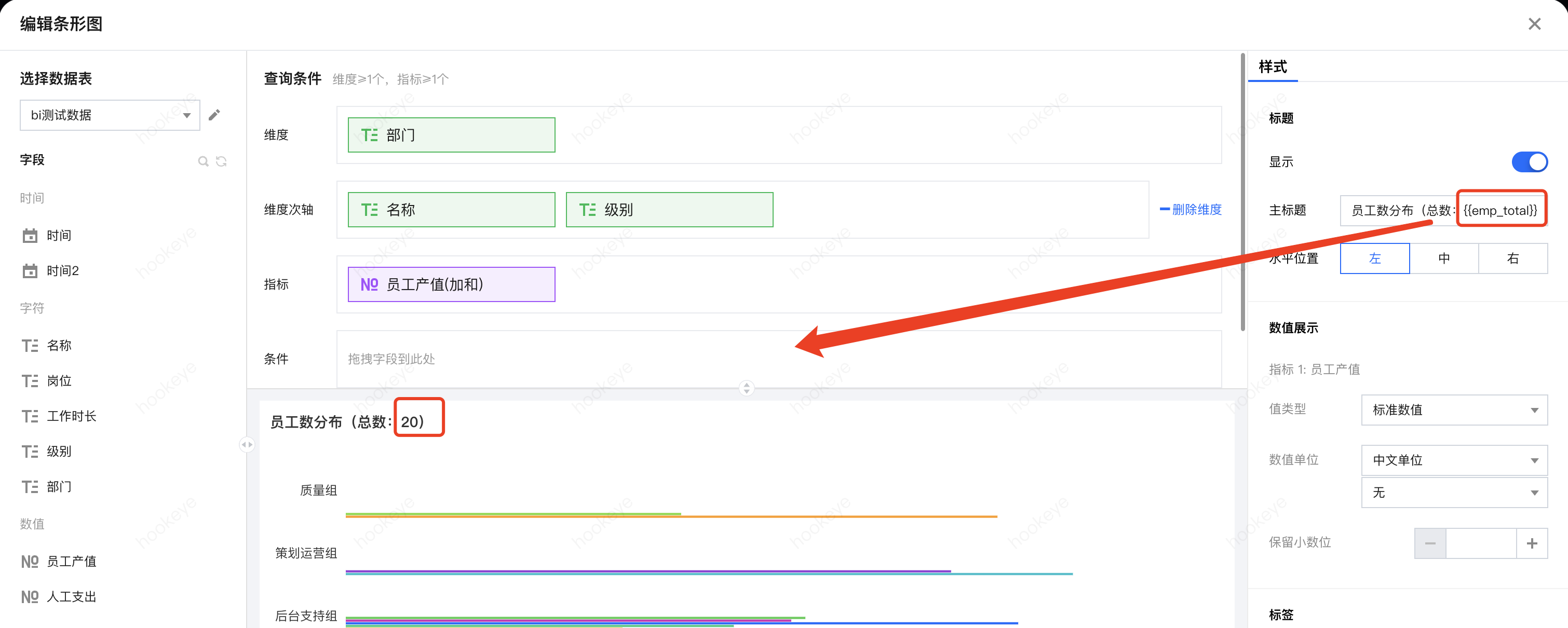 1.2 插入变量:在样式面板里,找到标题设置,在标题需要展示的位置,输入变量引用名“{{emp_total}}”;