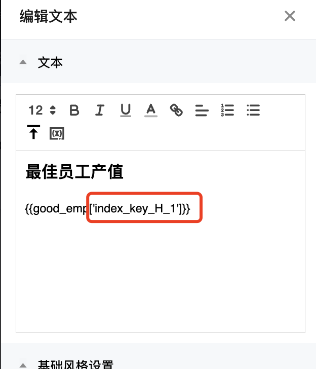 如对变量部分进行样式设置,请务必选择一个完整的变量引用体,如“{{emp_toatal}}”,切不可选择“{{emp”,否则变量无法解析。