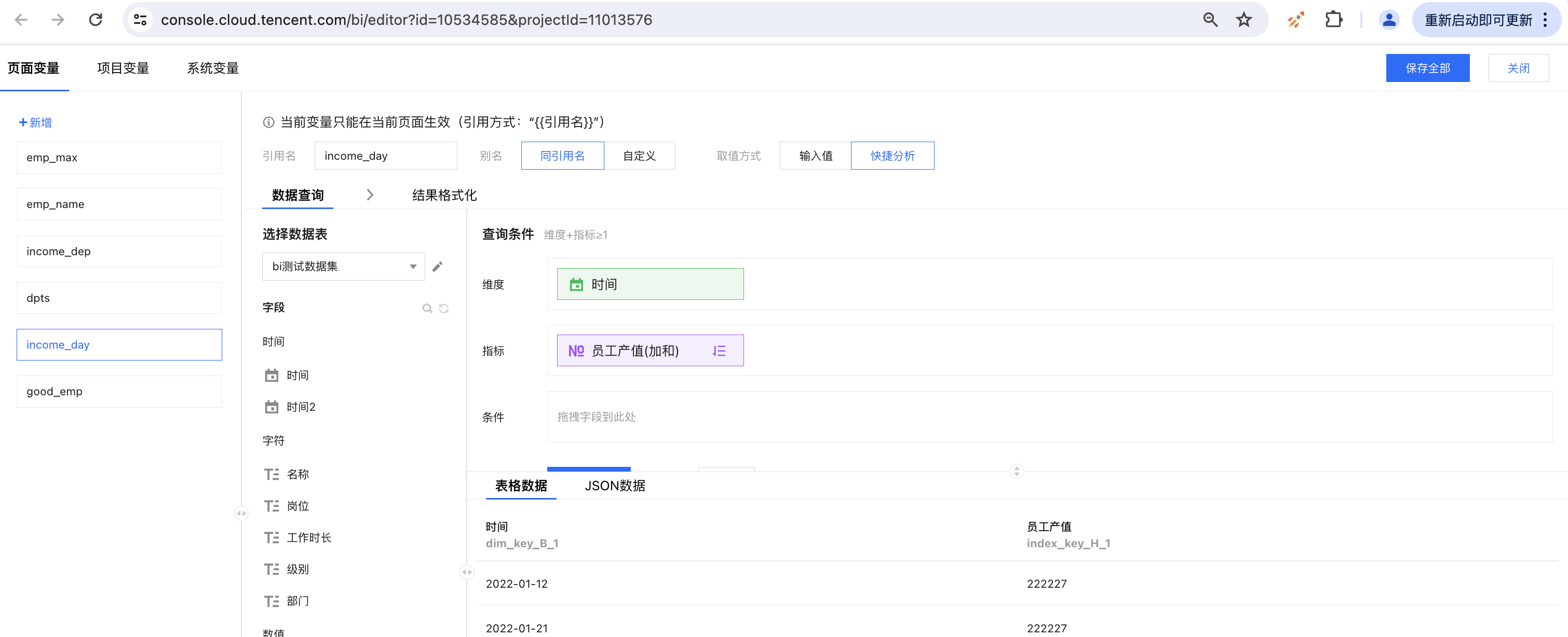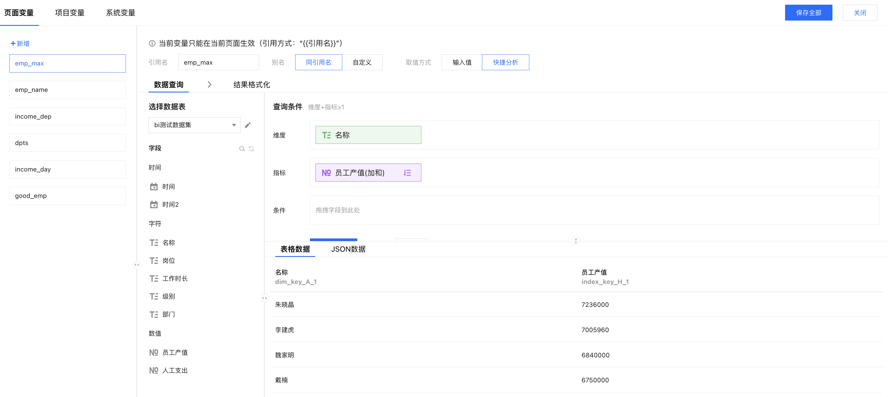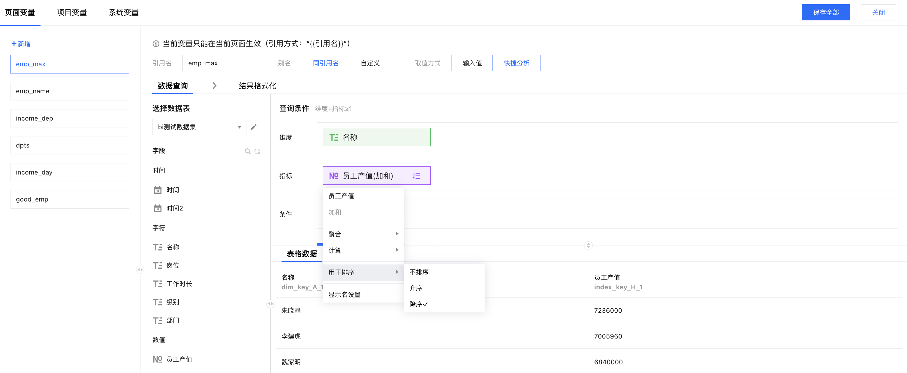 添加变量:打开变量面板,新增一个“emp_max”页面变量,设置维度和指标;其中产值进行倒序排列,以便获取产值最高的员工;