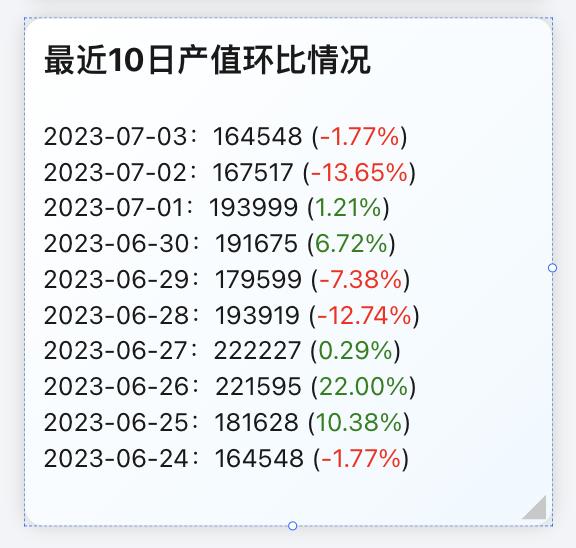 返回每一行的文本,此处生成了每一日的值和环比值,其中使用了 html 元素“<span style=''></span>”对环比值进行修饰;