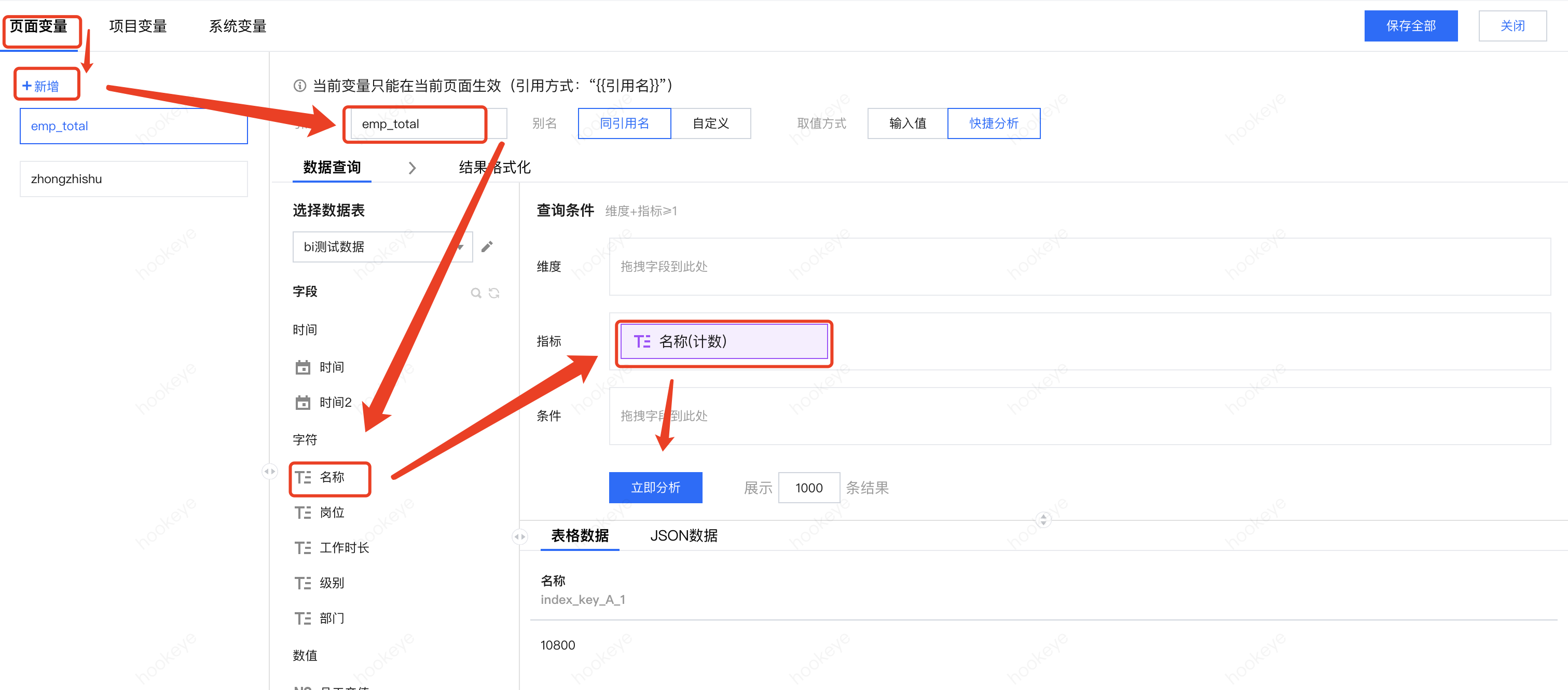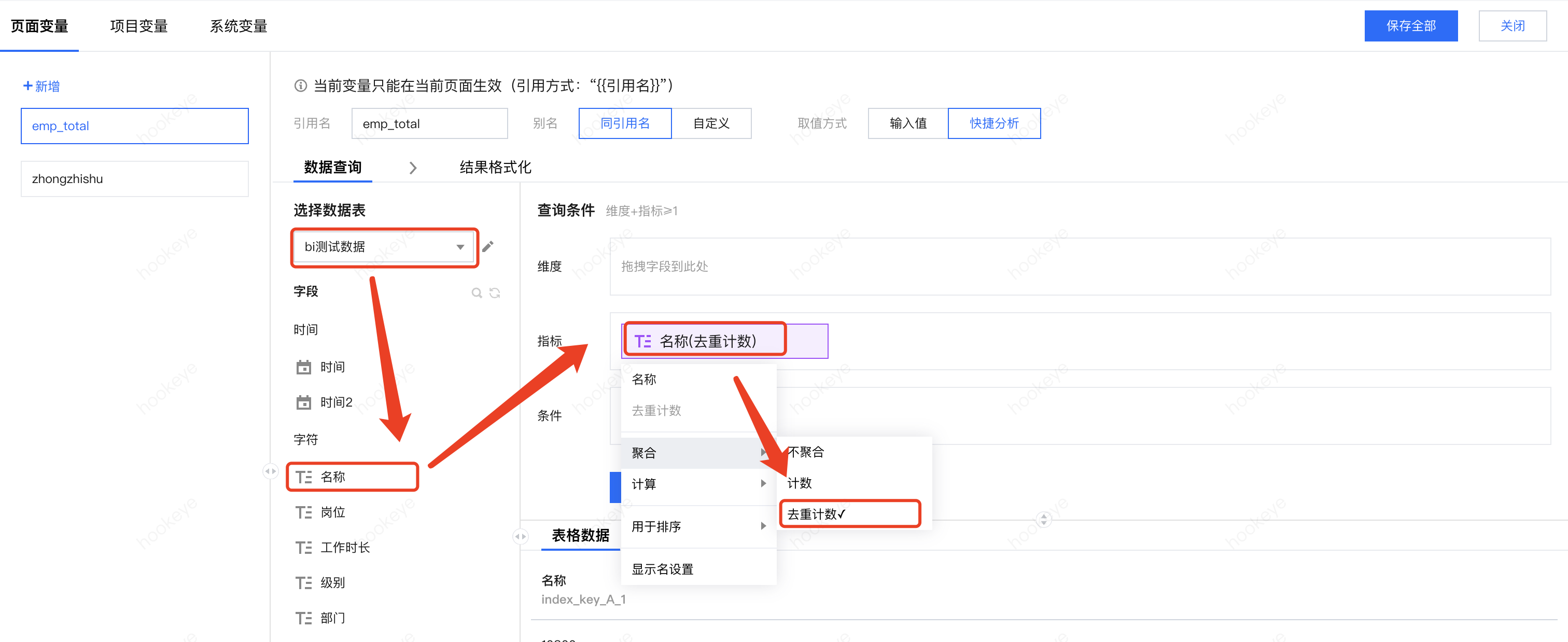 输入引用名:新变量引用名“emp_total”用来统计员工总数;引用名称是最重要的参数,必须英文及下划线格式,在变量调用时,通过该名称进行引用;为了便于编辑时分辨,用户也可以自定义变量名称,但是引用时,依然要求使用引用名;